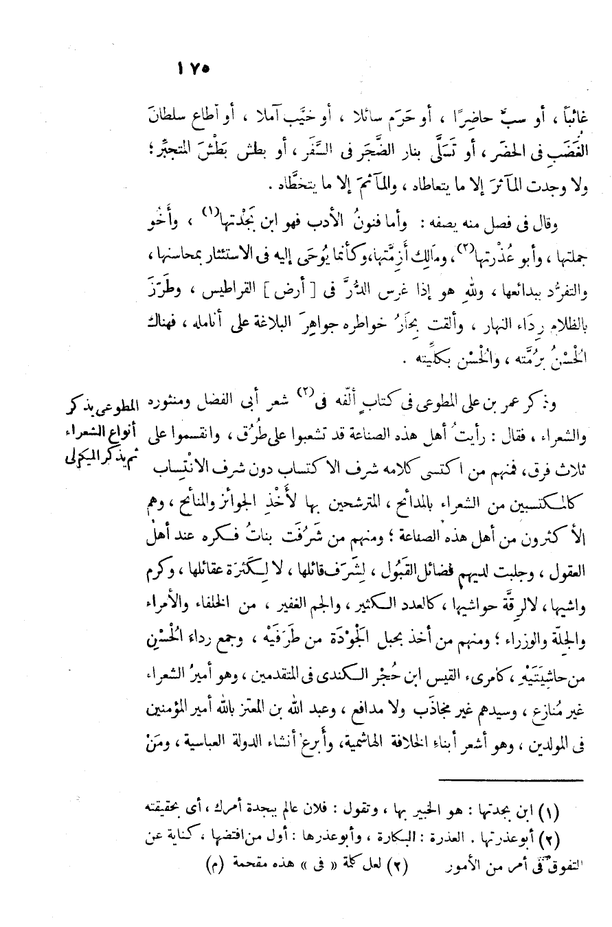 وذكر عمر بن على المطوعى في كتاب ألّفه فى «3» شعر أبى الفضل ومنثوره والشعراء، فقال: رأيت أهل هذه الصناعة قد تشعبوا على طرق، وانقسموا على ثلاث فرق، فمنهم من اكتسى كلامه شرف الاكتساب دون شرف الانتساب كالمكتسبين من الشعراء بالمدائح، المترشحين بها لأخذ الجوائز والمنائح، وهم الأكثرون من أهل هذه الصناعة؛ ومنهم من شرفت بنات فكره عند أهل العقول، وجلبت لديهم فضائل القبول، لشرف قائلها، لا لكثرة عقائلها، وكرم واشيها، لالرقّة حواشيها، كالعدد الكثير، والجم الغفير، من الخلفاء والأمراء والجلّة والوزراء؛ ومنهم من أخذ بحبل الجودة من طرفيه، وجمع رداء الحسن من حاشيتيه، كامرىء القيس ابن حجر الكندى في المتقدمين، وهو أمير الشعراء غير منازع، وسيدهم غير مجاذب ولا مدافع، وعبد الله بن المعتز بالله أمير المؤمنين فى المولدين، وهو أشعر أبناء الخلافة الهاشمية، وأبرع أنشاء الدولة العباسية، ومن