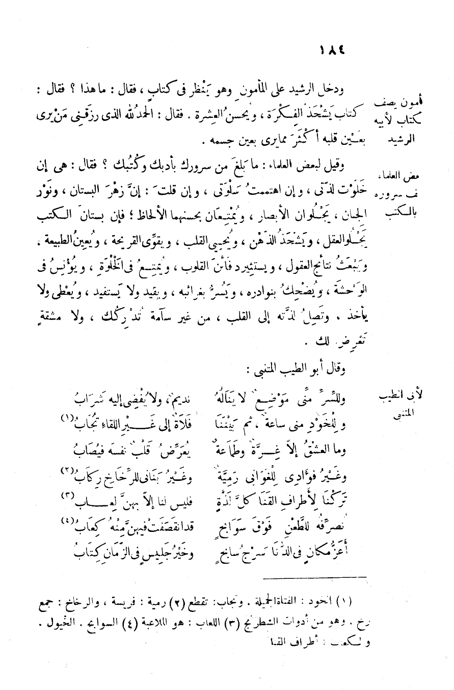 وقيل لبعض العلماء: ما بلغ من سرورك بأدبك وكتبك؟ فقال: هى إن خلوت لذّتى، وإن اهتممت سلوتى، وإن قلت: إنّ زهر البستان، ونور الجنان، يجلوان الأبصار، ويمتعان بحسنهما الألحاظ؛ فإن بستان الكتب يجلو العقل، ويشحذ الذّهن، ويحيى القلب، ويقوّى القريحة، ويعين الطبيعة، ويبعث نتائج العقول، ويستثيرد فائن القلوب، ويمتع في الخلوة، ويؤنس في الوحشة، ويضحك بنوادره، ويسرّ بغرائبه، ويفيد ولا يستفيد، ويعطى ولا يأخذ، وتصل لذّته إلى القلب، من غير سآمة تدركك، ولا مشقة تعرض لك.