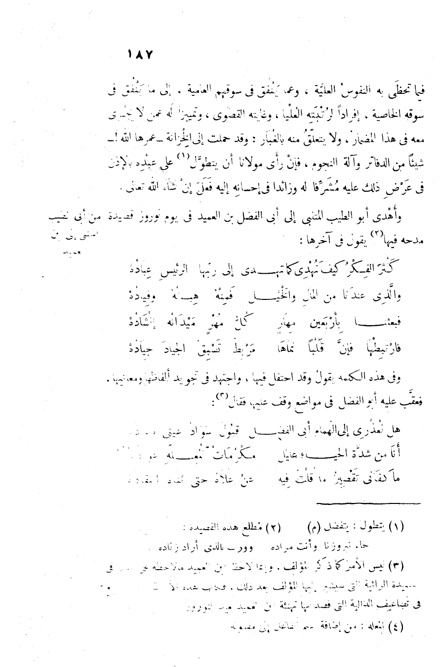 وأهدى أبو الطيب المتنبى إلى أبى الفضل بن العميد في يوم نوروز قصيدة مدحه فيها «2» يقول في آخرها: