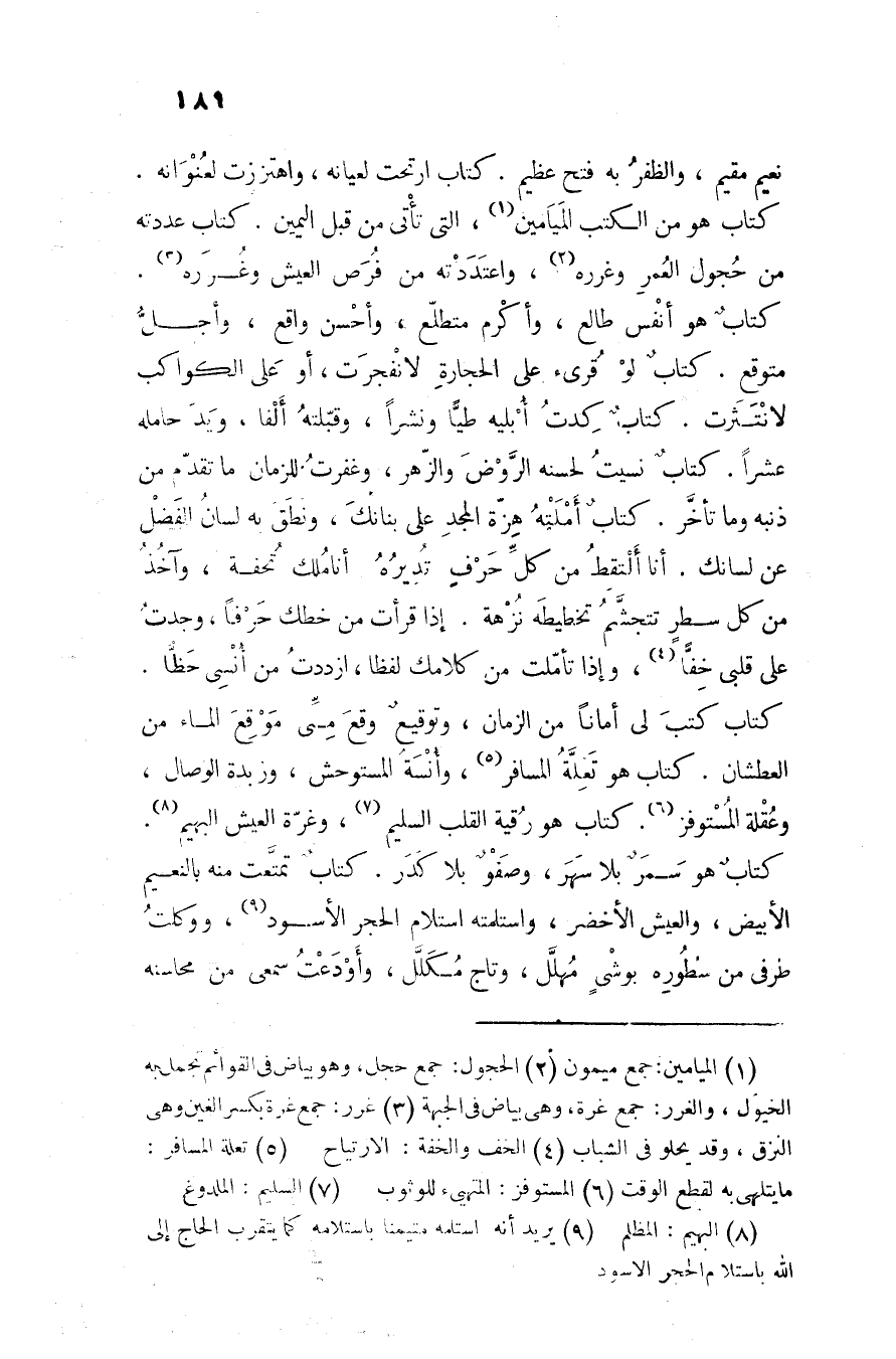 كتاب هو سمر بلا سهر، وصفو بلا كدر. كتاب تمتّعت منه بالنعيم الأبيض، والعيش الأخضر، واستلمته استلام الحجر الأسود «9» ، ووكلت طرفى من سطوره بوشى مهلّل، وتاج مكلّل، وأودعت سمعى من محاسنه