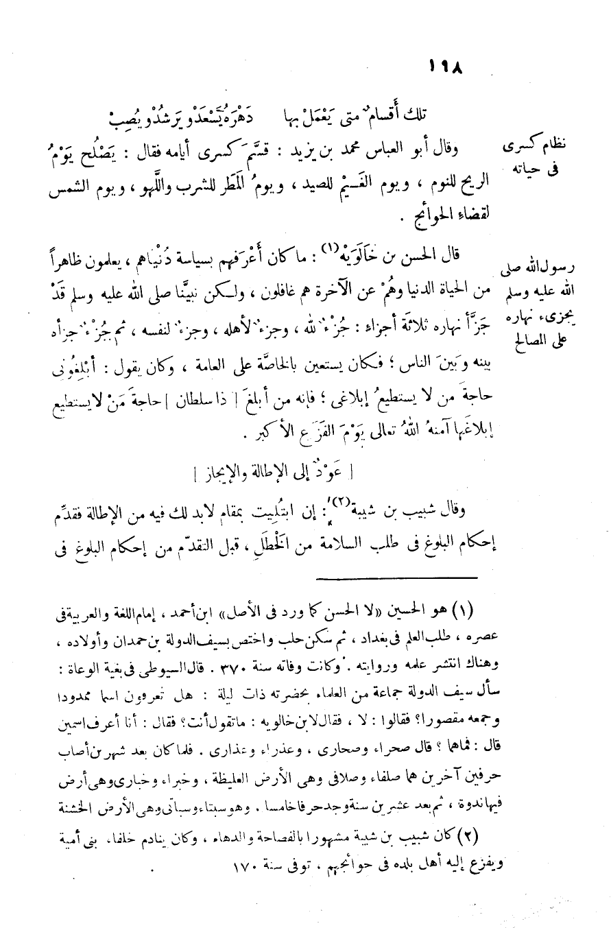 وقال أبو العباس محمد بن يزيد: قسّم كسرى أيامه فقال: يصلح يوم الريح للنوم، ويوم الغيم للصيد، ويوم المطر للشرب واللهو، ويوم الشمس لقضاء الحوائج.