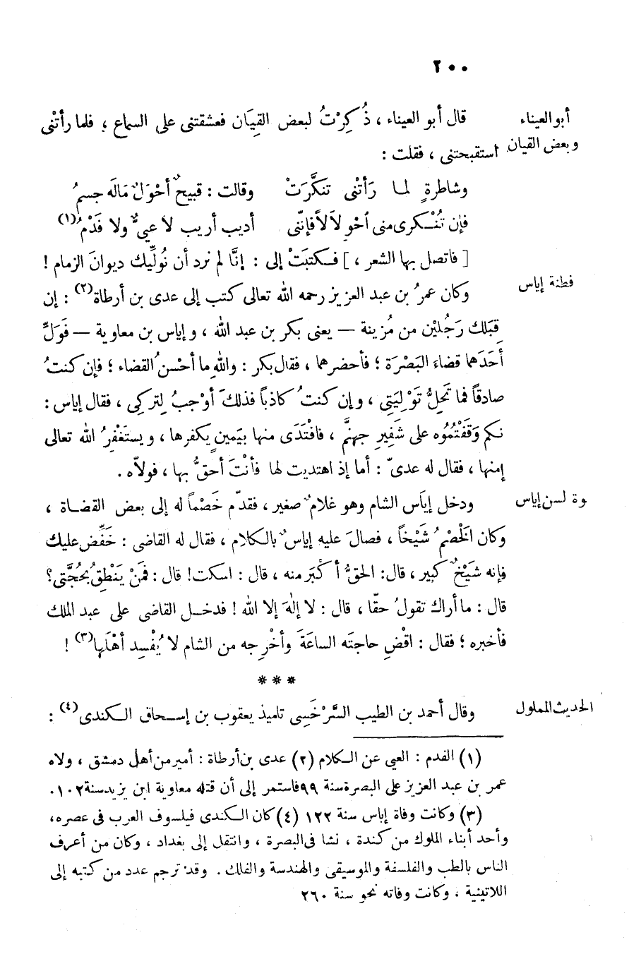 قال: ما أراك تقول حقّا، قال: لا إله إلا الله! فدخل القاضى على عبد الملك فأخبره؛ فقال: اقض حاجته الساعة وأخرجه من الشام لا يفسد أهلها «3» ! وقال أحمد بن الطيب السّرخسى تلميذ يعقوب بن إسحاق الكندى «4» :
