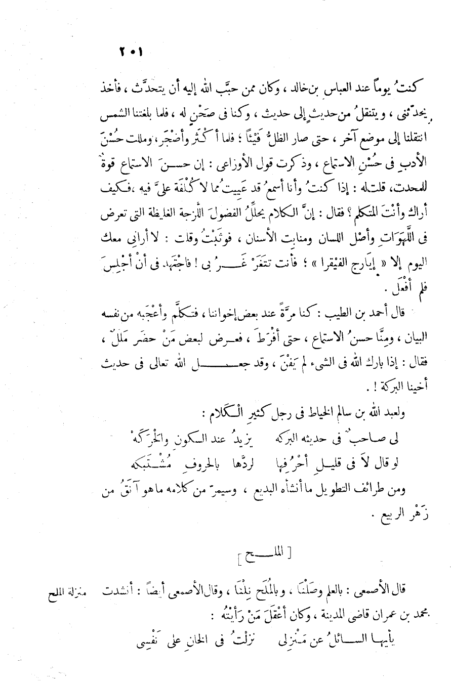 قال الأصمعى: بالعلم وصلنا، وبالملح نلنا، وقال الأصمعى أيضا: أنشدت محمد بن عمران قاضى المدينة، وكان أعقل من رأيته: