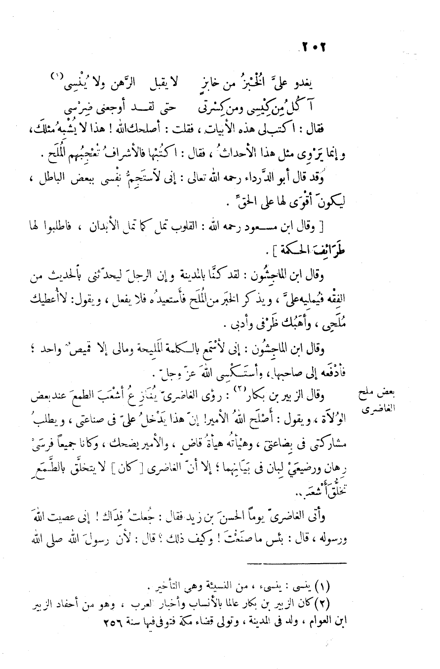 فقال: اكتب لى هذه الأبيات، فقلت: أصلحك الله! هذا لا يشبه مثلك، وإنما يروى مثل هذا الأحداث، فقال: اكتبها فالأشراف تعجبهم الملح.