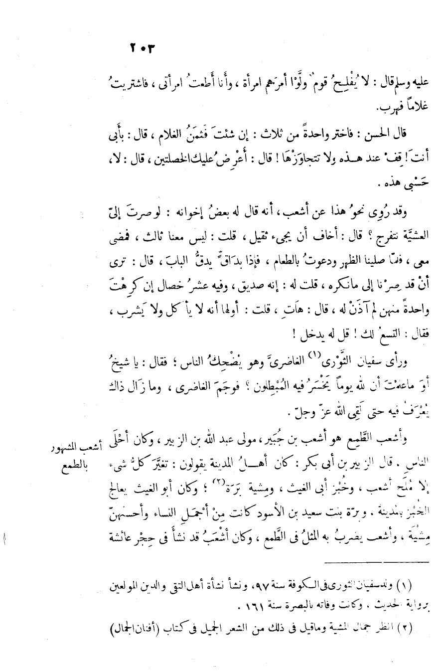 وأشعب الطّمع هو أشعب بن جبير، مولى عبد الله بن الزبير، وكان أحلى الناس، قال الزبير بن أبى بكر: كان أهل المدينة يقولون: تغيّر كلّ شىء إلا ملح أشعب، وخبز أبى الغيث، ومشية برّة «2» ؛ وكان أبو الغيث يعالج الخبز بالمدينة، وبرّة بنت سعيد بن الأسود كانت من أجمل النساء وأحسنهنّ مشية، وأشعب يضرب به المثل في الطّمع، وكان أشعب قد نشأ في حجر عائشة