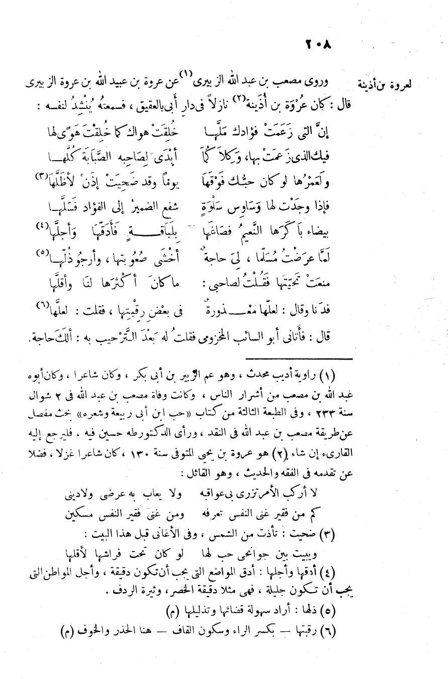 وروى مصعب بن عبد الله الزبيرى «1» عن عروة بن عبيد الله بن عروة الزبيرى قال: كان عروة بن أذينة «2» نازلا في دار أبى بالعقيق، فسمعته ينشد لنفسه: