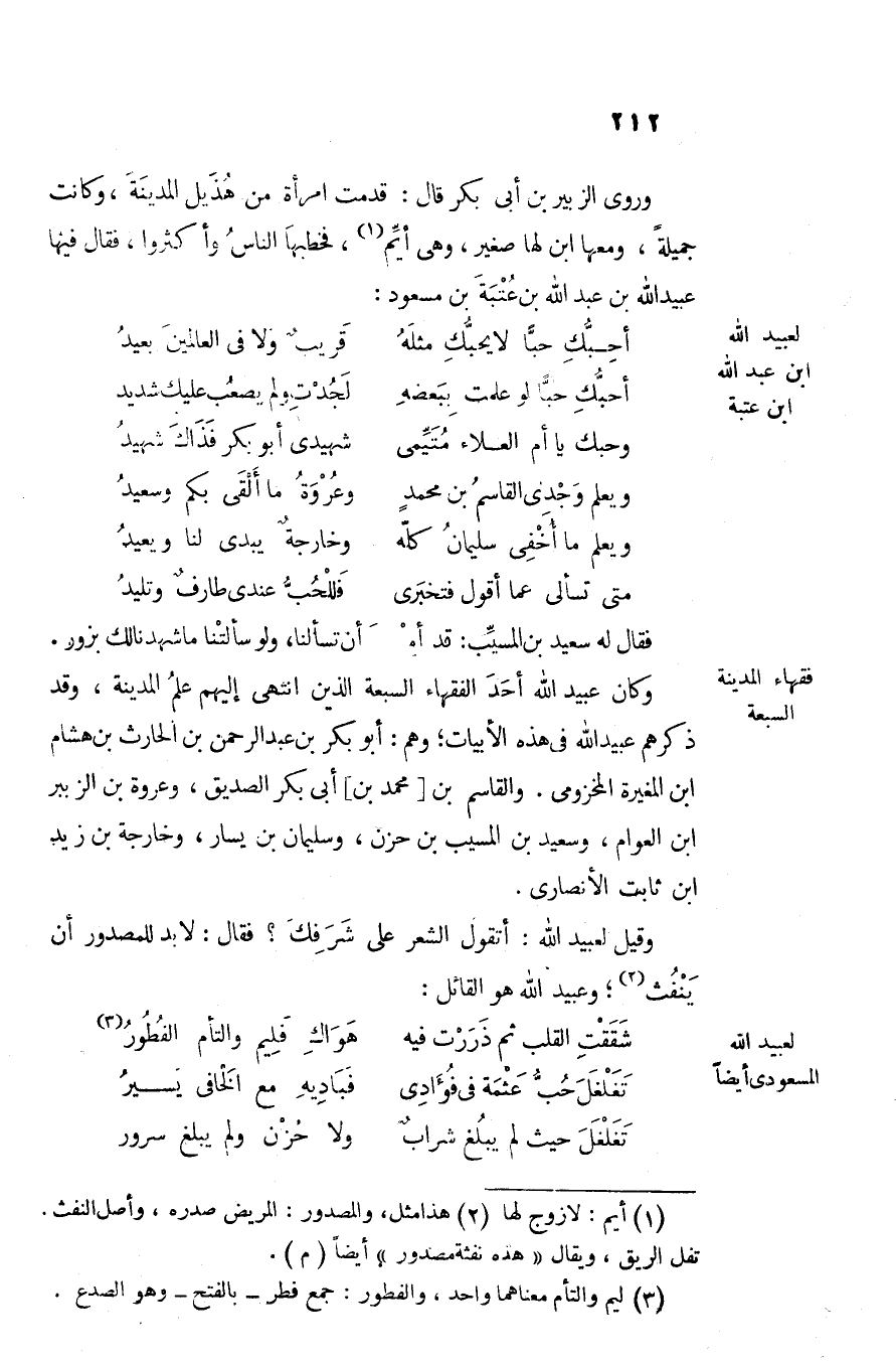 وروى الزبير بن أبى بكر قال: قدمت امرأة من هذيل المدينة، وكانت جميلة، ومعها ابن لها صغير، وهي أيّم «1» ، فخطبها الناس وأكثروا، فقال فيها عبيد الله بن عبد الله بن عتبة بن مسعود: