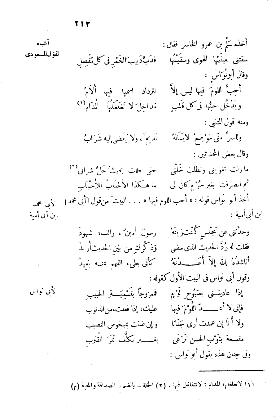 أخذ أبو نواس قوله: «أحب اللوم فيها» ... البيت من قول [أبى محمد] ابن أبى أمية: