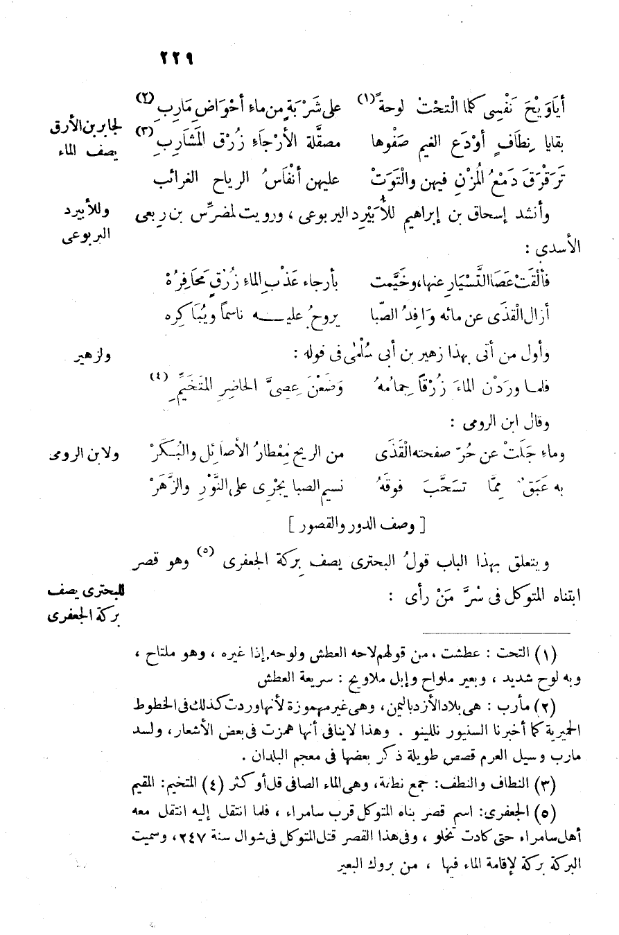 ويتعلق بهذا الباب قول البحترى يصف بركة الجعفرى «5» وهو قصر ابتناه المتوكل في سرّ من رأى: