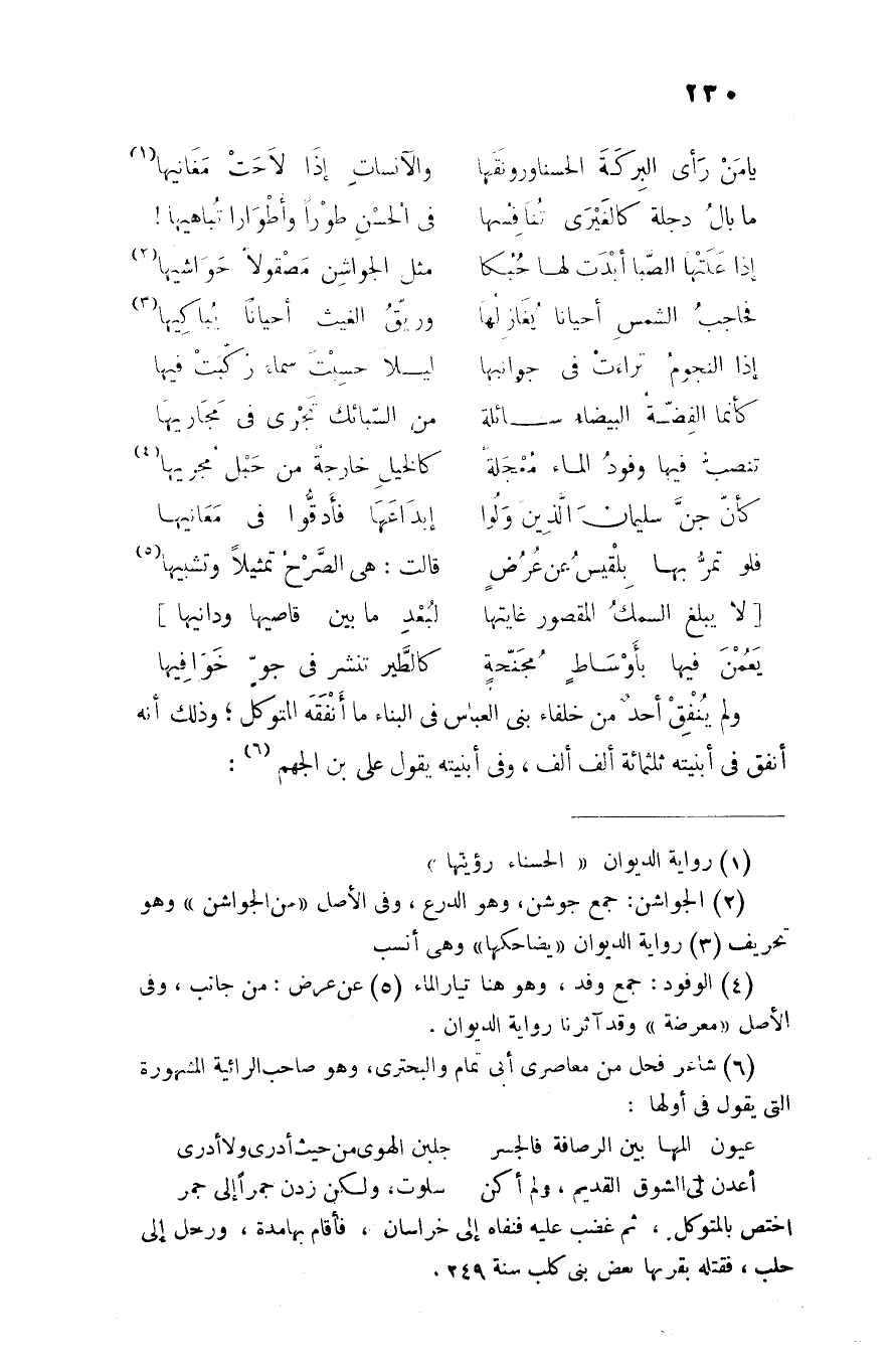 ولم ينفق أحد من خلفاء بنى العباس في البناء ما أنفقه المتوكل؛ وذلك أنه أنفق في أبنيته ثلاثمائة ألف ألف، وفي أبنيته يقول على بن الجهم «6» :