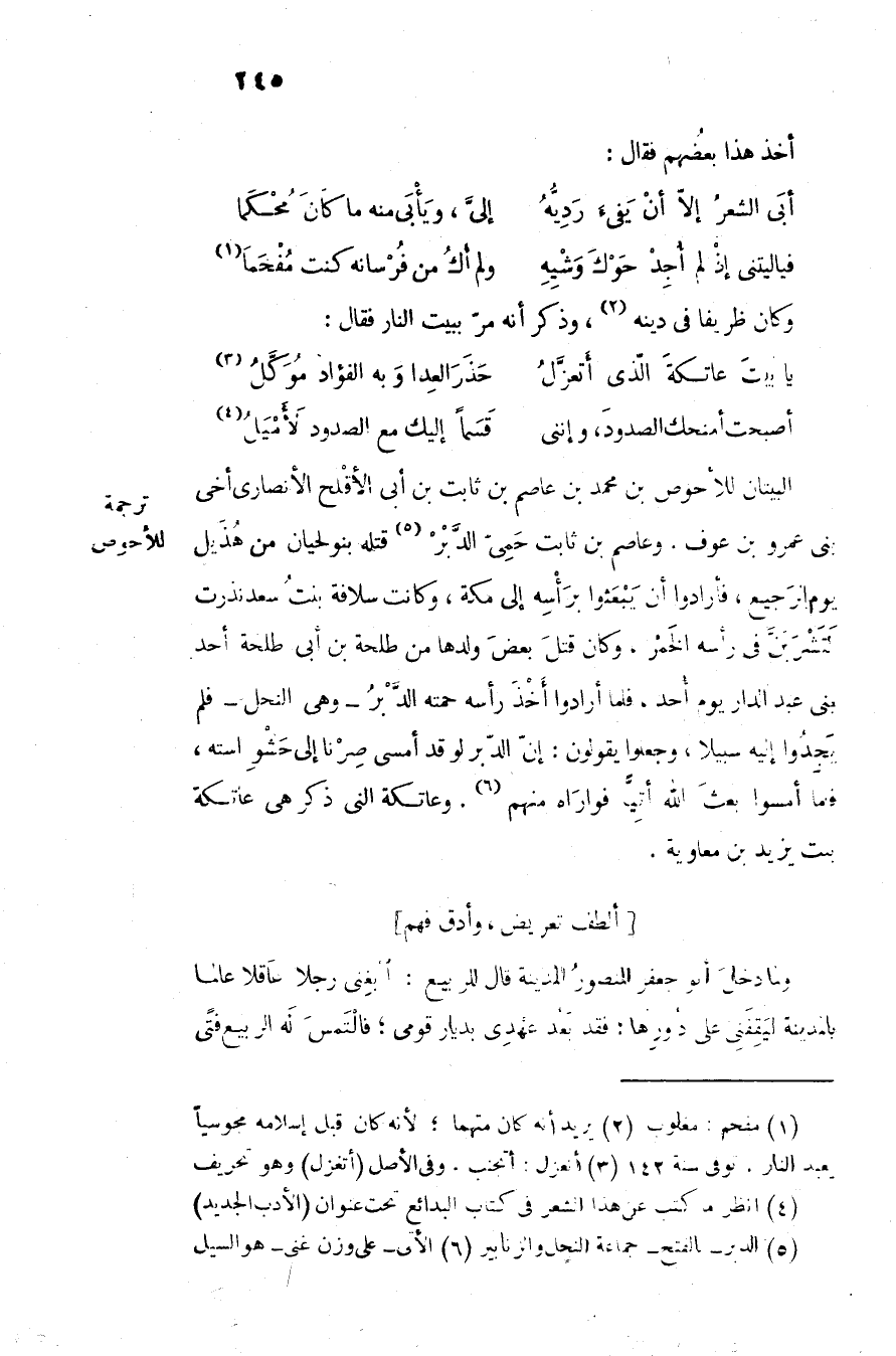 البيتان للأحوص بن محمد بن عاصم بن ثابت بن أبى الأقلح الأنصارى أخى بنى عمرو بن عوف. وعاصم بن ثابت حمىّ الدّبر «5» قتله بنولحيان من هذيل يوم الرجيع، فأرادوا أن يبعثوا برأسه إلى مكة، وكانت سلافة بنت سعد نذرت لتشربنّ في رأسه الخمر، وكان قتل بعض ولدها من طلحة بن أبى طلحة أحد بنى عبد الدار يوم أحد، فلما أرادوا أخذ رأسه حمته الدّبر- وهي النحل- فلم يجدوا إليه سبيلا، وجعلوا يقولون: إنّ الدّبر لو قد أمسى صرنا إلى حشو استه، فلما أمسوا بعث الله أتيّا فواراه منهم «6» . وعاتكة التي ذكر هي عاتكة بنت يزيد بن معاوية.