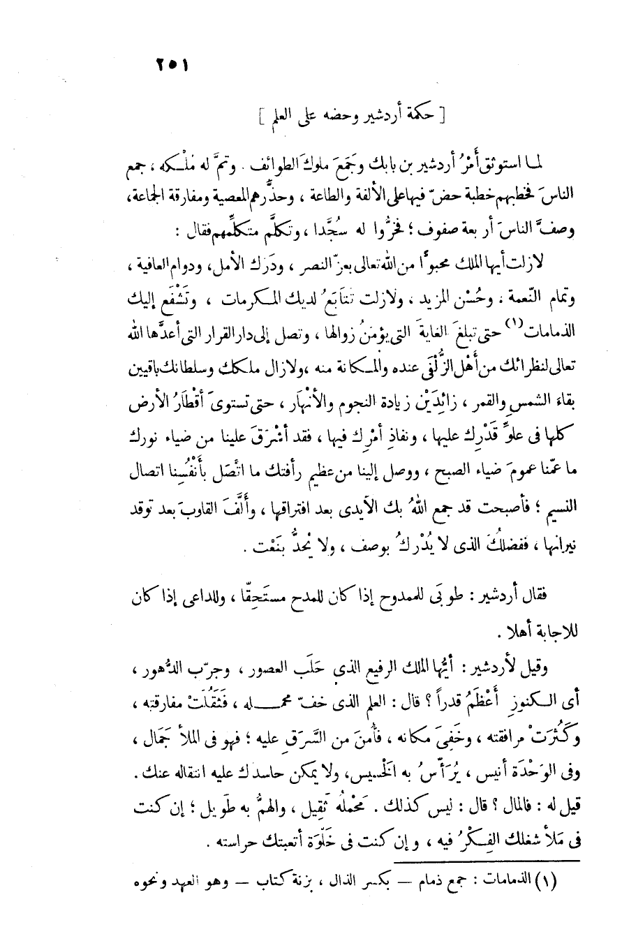وقيل لأردشير: أيّها الملك الرفيع الذى حلب العصور، وجرّب الدّهور، أى الكنوز أعظم قدرا؟ قال: العلم الذى خفّ محمله، فثقلت مفارقته، وكثرت مرافقته، وخفى مكانه، فأمن من السّرق عليه؛ فهو في الملأ جمال، وفي الوحدة أنيس، يرأّس به الخسيس، ولا يمكن حاسدك عليه انتقاله عنك.