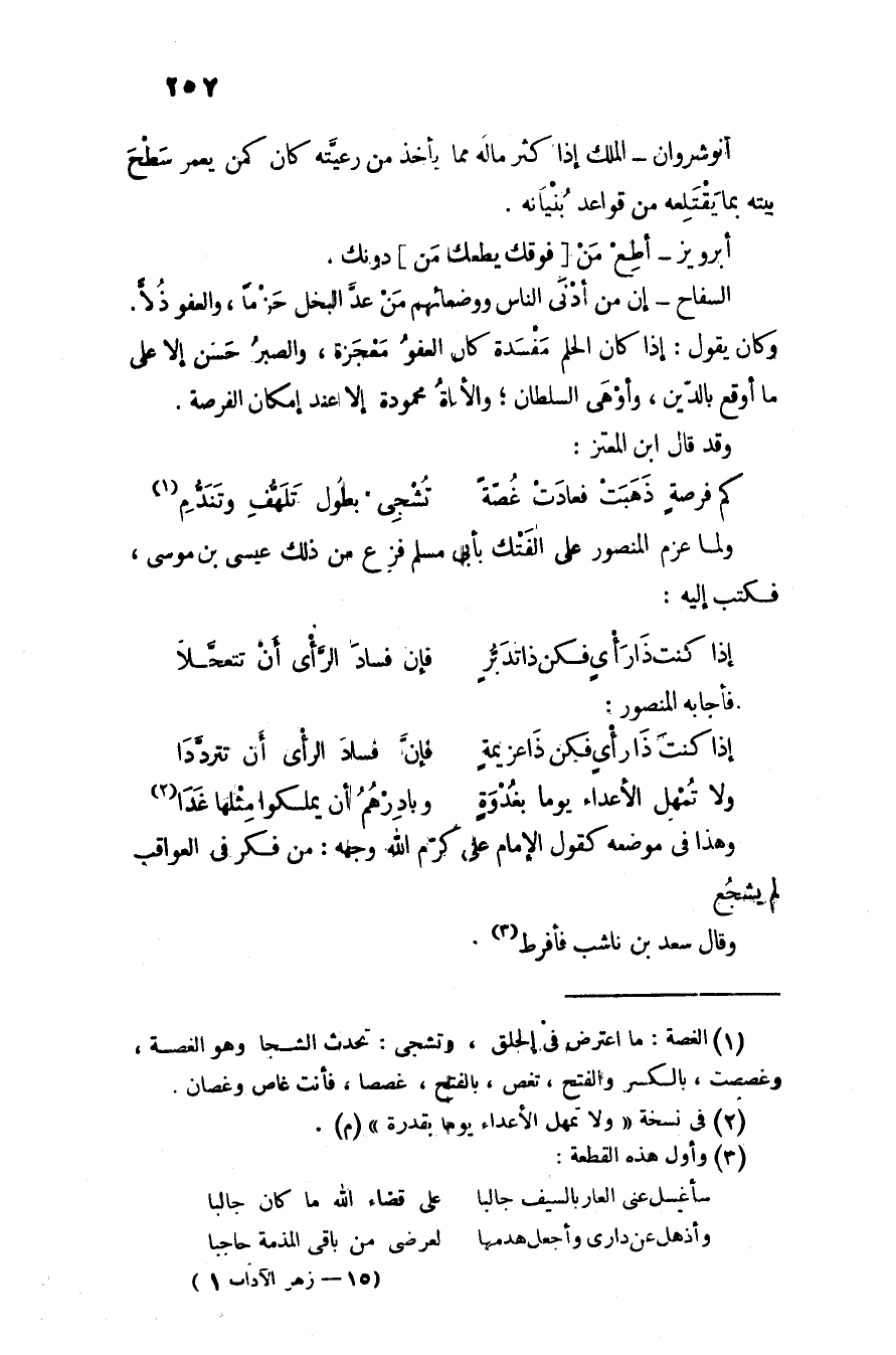 وكان يقول: إذا كان الحلم مفسدة كان العفو معجزة، والصبر حسن إلا على ما أوقع بالدّين، وأوهى السلطان؛ والأماة محمودة إلا عند إمكان الفرصة.