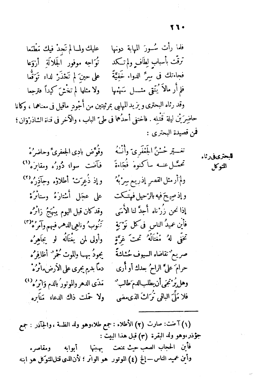 وقد رثاه البحترى ويزيد المهلبى بمرثيتين من أجود ما قيل في معناهما، وكانا حاضرين ليلة قتله. فاختفى أحدهما في طىّ الباب، والآخر في قناة الشاذروان؛ فمن قصيدة البحترى: