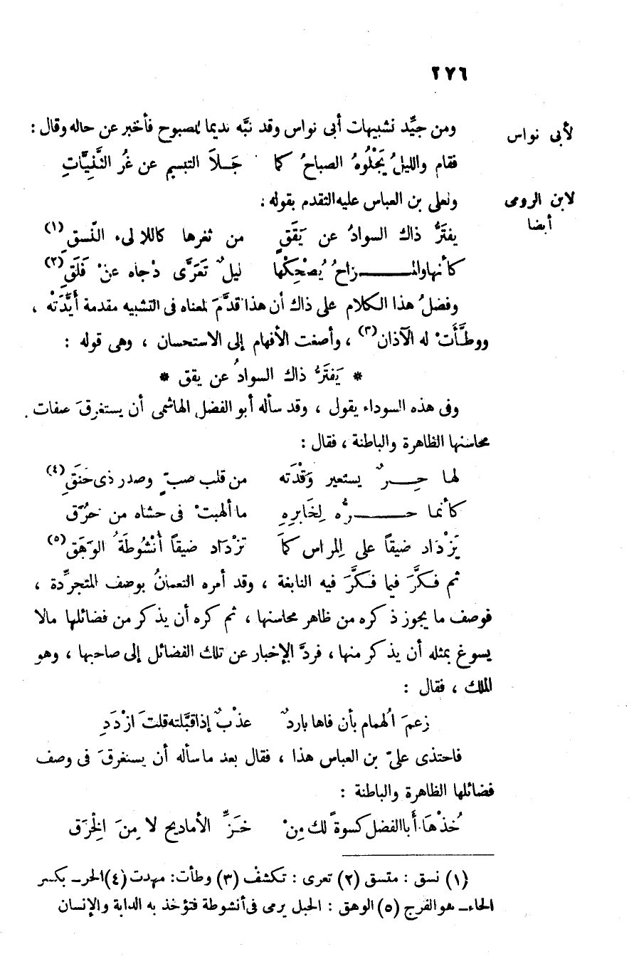 ثم فكّر فيما فكّر فيه النابغة، وقد أمره النعمان بوصف المتجرّدة، فوصف ما يجوز ذكره من ظاهر محاسنها، ثم كره أن يذكر من فضائلها مالا يسوغ بمثله أن يذكر منها، فردّ الإخبار عن تلك الفضائل إلى صاحبها، وهو الملك، فقال: