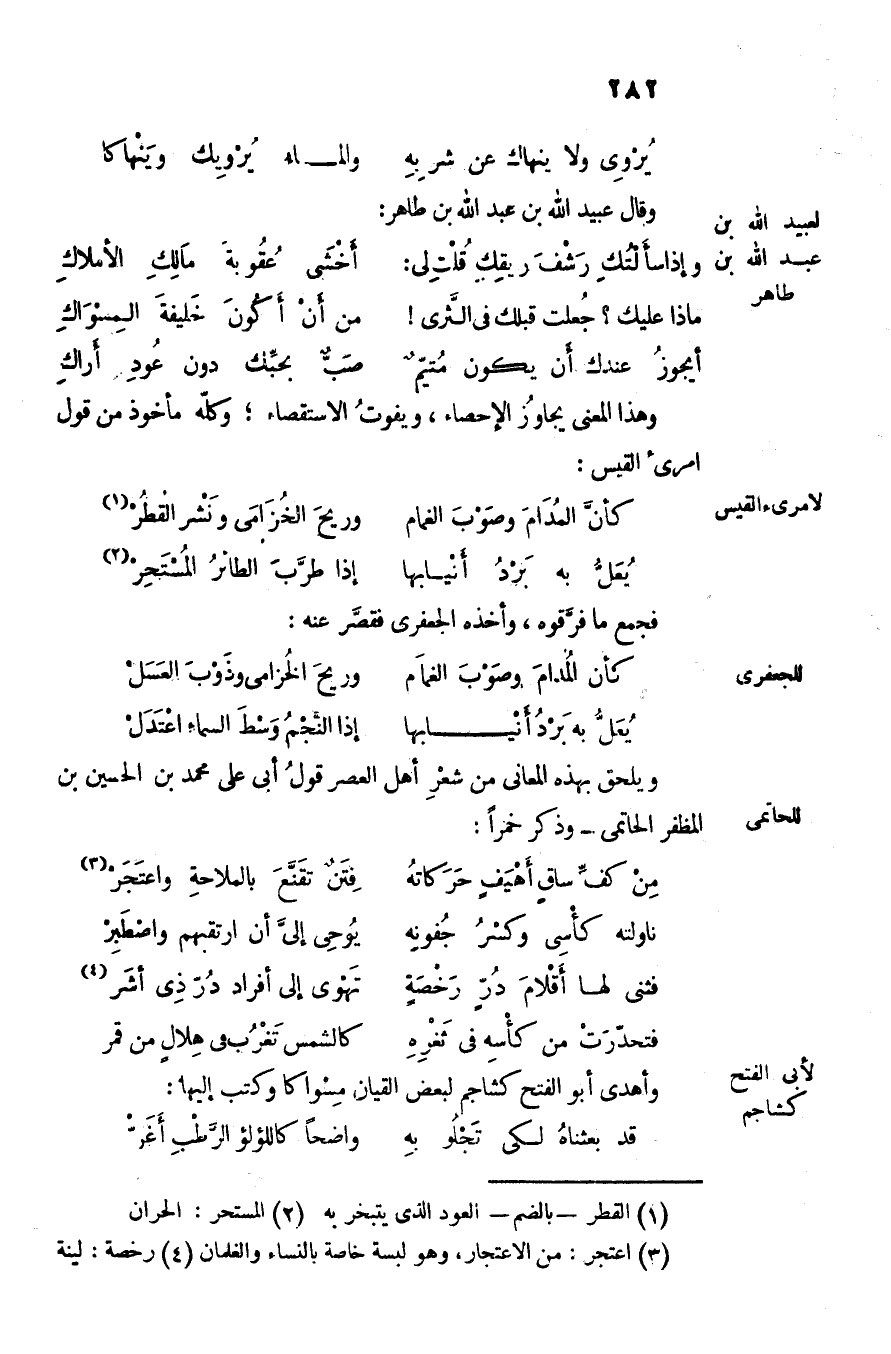 ويلحق بهذه المعانى من شعر أهل العصر قول أبى على محمد بن الحسين بن المظفر الحاتمى- وذكر خمرا: