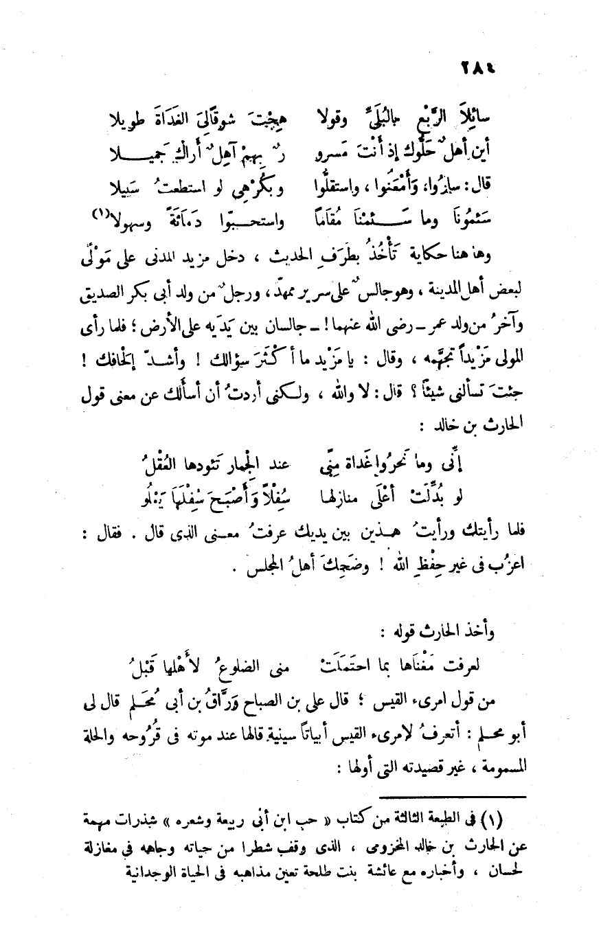 وهاهنا حكاية تأخذ بطرف الحديث، دخل مزيد المدنى على مولى لبعض أهل المدينة، وهو جالس على سرير ممهّد، ورجل من ولد أبى بكر الصديق وآخر من ولد عمر- رضي الله عنهما! - جالسان بين يديه على الأرض؛ فلما رأى المولى مزيدا تجهّمه، وقال: يا مزيد ما أكثر سؤالك! وأشدّ إلحافك! جئت تسألنى شيئا؟ قال: لا والله، ولكنى أردت أن أسألك عن معنى قول الحارث بن خالد:
