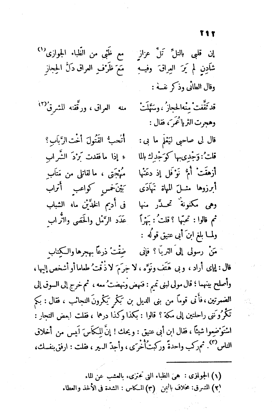 استوضعوا شيئا، فقال ابن أبى عتيق: ويحك! إنّ المكاس ليس من أخلاق الناس «3» . ثم ركب واحدة وركبت أخرى، وأجدّ السير، فقلت: ارفق بنفسك،
