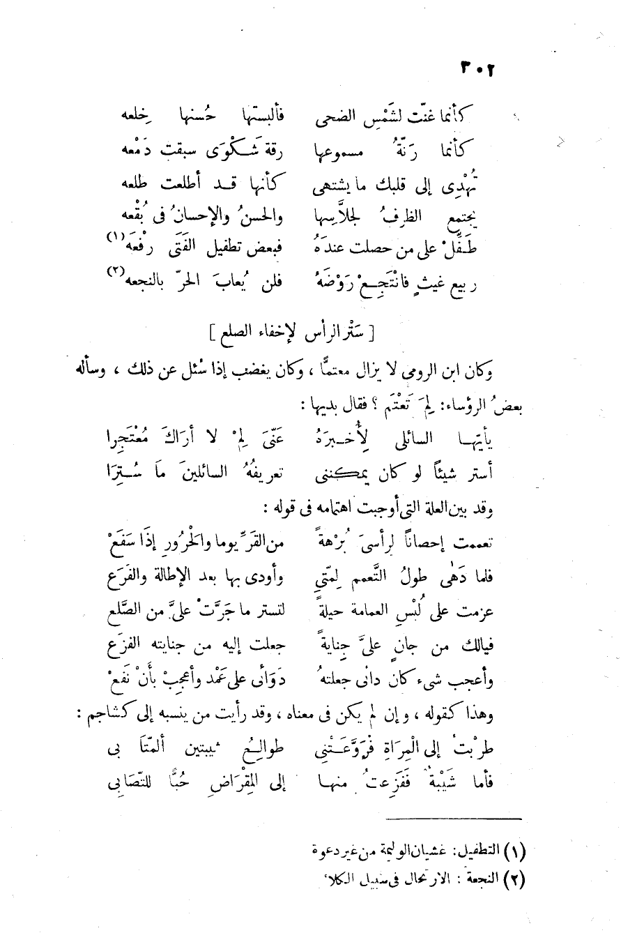 وكان ابن الرومى لا يزال معتمّا، وكان يغضب إذا سئل عن ذلك، وسأله بعض الرؤساء: لم تعتم؟ فقال بديها: