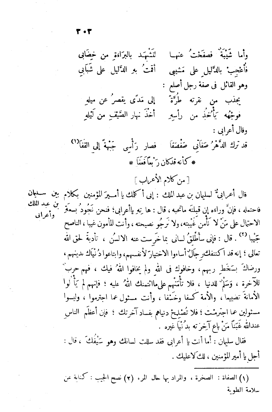 قال أعرابىّ لسليمان بن عبد الملك: إنى أكلمك يا أمير المؤمنين بكلام فاحتمله، فإنّ وراءه إن قبلته ما تحبه، قال: هاته يا أعرابى؛ فنحن نجود بسعة الاحتمال على من لا نأمن غيبته، ولا نرجو نصيحته، وأنت المأمون غيبا، الناصح جيبا «2» . قال: فإنى سأطلق لسانى بما خرست عنه الالسن، تأدية لحق الله تعالى؛ إنه قد اكتنفك رجال أساءوا الاختيار لأنفسهم، وابتاعوا دنياك بدينهم، ورضاك بسخط ربهم، وخافوك في الله ولم يخافوا الله فيك، فهم حرب للآخرة، وسلم للدنيا، فلا تأمنهم على ما ائتمنك الله عليه؛ فإنهم لم يألوا الأمانة تضييعا، والأمة كسفا وخسفا، وأنت مسئول عما اجترموا، وليسوا مسئولين عما اجترمت؛ فلا تصلح دنياهم بفساد آخرتك؛ فإن أعظم الناس عند الله غبنا من باع آخرته بدنيا غيره.