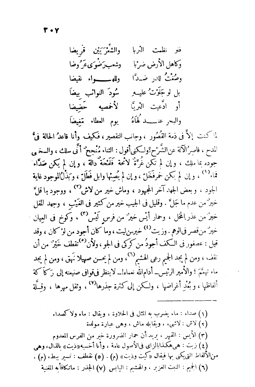 لما كنت إلّا في ذمة القصور، وجانب التقصير، فكيف وأنا قاعد الحالة فىّ المدح، قاصر الآلة عن الشّرح؟ ولكنى أقول: الثناء منجح أنّى سلك، والسخى جوده بما ملك، وإن لم تكن غرّة لائحة فلمحة دالة، وإن لم يكن صدّاء فماء «1» ، وإن لم يكن خمر فخلّ، وإن لم يصبها وابل فطلّ، وبذل الموجود غاية الجود، وبعض الجهد آخر المجهود، وماش خير من لاش «2» ، ووجود ما قلّ خير من عدم ما جلّ. وقليل في الجيب خير من كثير في الغيب، وجهد المقل خير من عذر المخل، وحمار أيس خير من فرس ليس «3» ، وكوخ في العيان خير من قصر في الوهم. وزيت «4» خير من ليت، وما كان أجود من لو كان، وقد قيل: عصفور في الكف أجود من كركى في الجو، ولأن «5» تقطف خير من أن تقف، ومن لم يجد الجميم رعى الهشيم «6» ، ومن لم يحسن صهيلا نهق، ومن لم يجد ماء تيمّم؛ والأمير الرئيس- أدام الله نعماه! - لا ينظر في قوافى صنيعته إلى ركاكة ألفاظها، وبعد أغراضها، ولكن إلى كثرة جذرها «7» ، وثقل مهرها، وقلّة