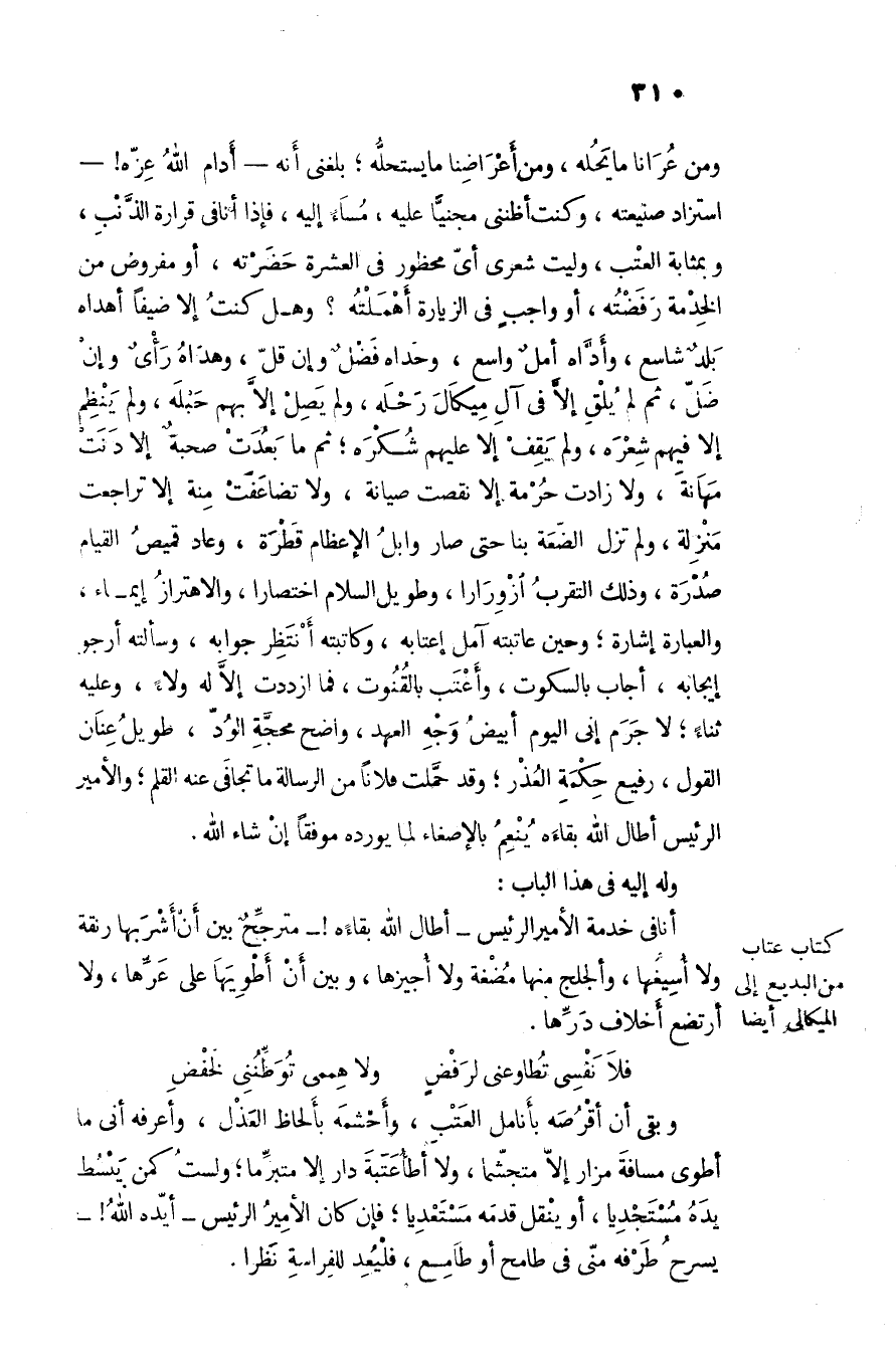 ومن عرانا ما يحله، ومن أعراضنا ما يستحلّه؛ بلغنى أنه- أدام الله عزّه! - استزاد صنيعته، وكنت أظننى مجنيّا عليه، مساء إليه، فإذا أنافى قرارة الذّنب، وبمثابة العتب، وليت شعرى أىّ محظور في العشرة حضرته، أو مفروض من الخدمة رفضته، أو واجب في الزيارة أهملته؟ وهل كنت إلا ضيفا أهداه بلد شاسع، وأدّاه أمل واسع، وحداه فضل وإن قلّ، وهداه رأى وإن ضلّ، ثم لم يلق إلّا في آل ميكال رحله، ولم يصل إلّا بهم حبله، ولم ينظم إلا فيهم شعره، ولم يقف إلا عليهم شكره؛ ثم ما بعدت صحبة إلا دنت مهانة، ولا زادت حرمة إلا نقصت صيانة، ولا تضاعفت منة إلا تراجعت منزلة، ولم تزل الضّعة بنا حتى صار وابل الإعظام قطرة، وعاد قميص القيام صدرة، وذلك التقرب أزورارا، وطويل السلام اختصارا، والاهتزاز إيماء، والعبارة إشارة؛ وحين عاتبته آمل إعتابه، وكاتبته أنتظر جوابه، وسألته أرجو إيجابه، أجاب بالسكوت، وأعتب بالقنوت، فما ازددت إلّا له ولاء، وعليه ثناء؛ لا جرم إنى اليوم أبيض وجه العهد، واضح محجّة الودّ، طويل عنان القول، رفيع حكمة العذر؛ وقد حمّلت فلانا من الرسالة ما تجافى عنه القلم؛ والأمير الرئيس أطال الله بقاءه ينعم بالإصغاء لما يورده موفقا إن شاء الله.