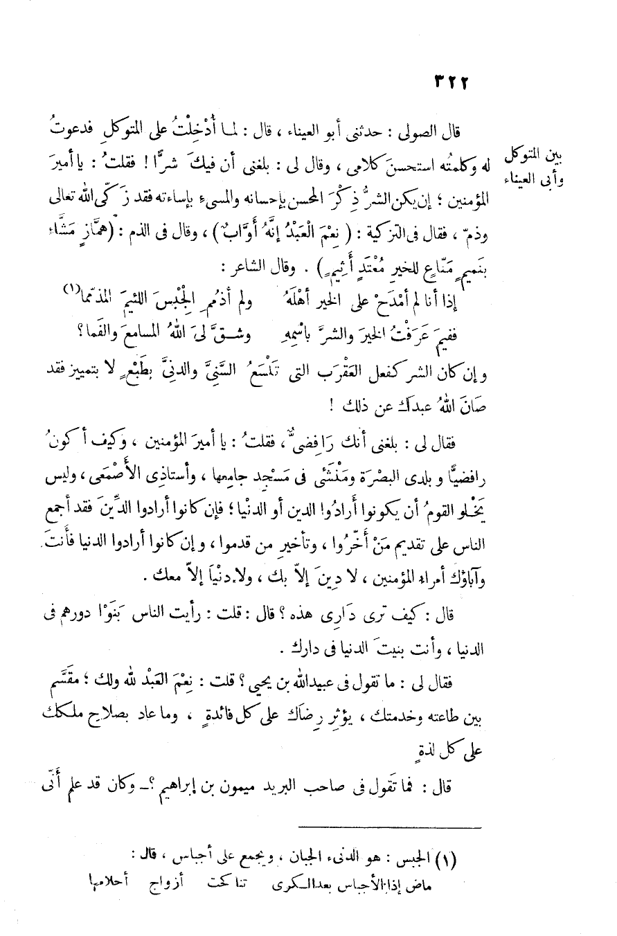 وإن كان الشر كفعل العقرب التي تلسع السّنىّ والدنىّ بطبع لا بتمييز فقد صان الله عبدك عن ذلك! فقال لى: بلغنى أنك رافضىّ، فقلت: يا أمير المؤمنين، وكيف أكون رافضيّا وبلدى البصرة ومنشئى في مسجد جامعها، وأستاذى الأصمعى، وليس يخلو القوم أن يكونوا أرادوا الدين أو الدنيا؛ فإن كانوا أرادوا الدّين فقد أجمع الناس على تقديم من أخّروا، وتأخير من قدموا، وإن كانوا أرادوا الدنيا فأنت وآباؤك أمراء المؤمنين، لا دين إلّا بك، ولا دنيا إلّا معك.