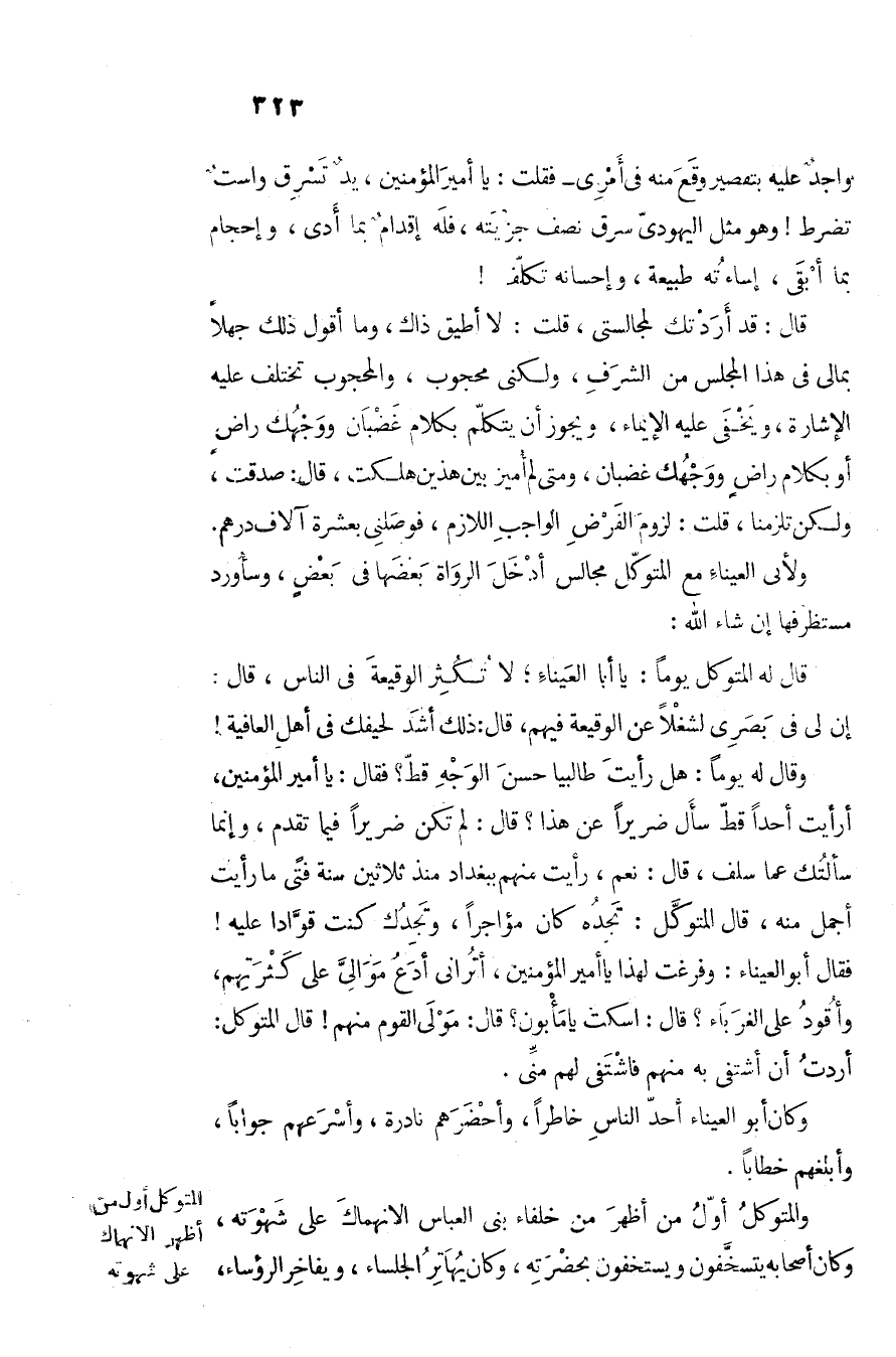والمتوكل أوّل من أظهر من خلفاء بنى العباس الانهماك على شهوته، وكان أصحابه يتسخّفون ويستخفون بحضرته، وكان يهاتر الجلساء، ويفاخر الرؤساء،