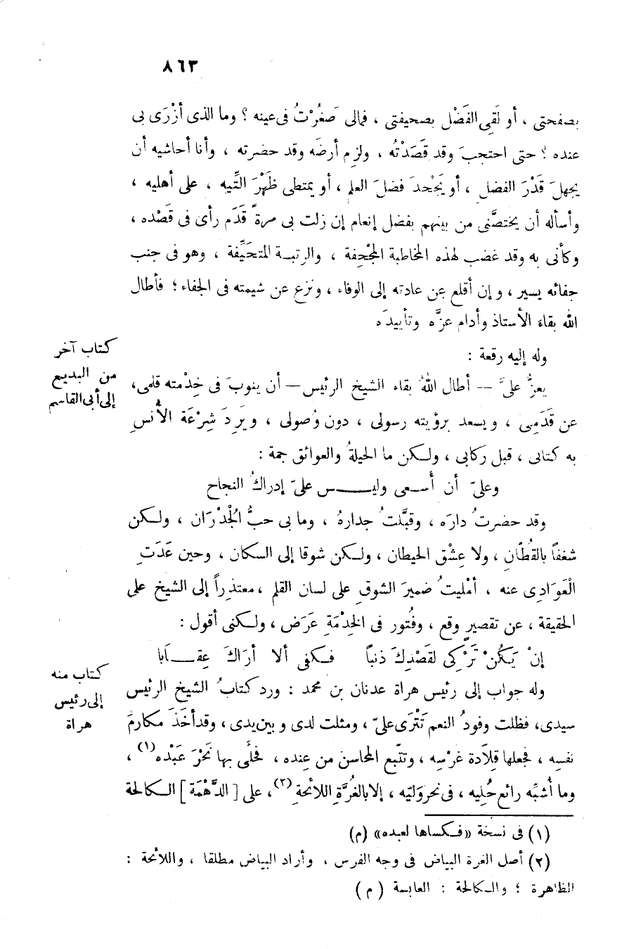 بصفحتى، أو لقى الفضل بصحيفتى، فمالى صغرت فى عينه؟ وما الذى أزرى بى عنده؟ حتى احتجب وقد قصدته، ولزم أرضه وقد حضرته، وأنا أحاشيه أن يجهل قدر الفضل، أو يجحد فضل العلم، أو يمتطى ظهر التّيه، على أهليه، وأسأله أن يختصّنى من بينهم بفضل إنعام إن زلت بى مرة قدم رأى فى قصده، وكأنى به وقد غضب لهذه المخاطبة المجحفة، والرتبة المتحيّفة، وهو فى جنب جفائه يسير، وإن أقلع عن عادته إلى الوفاء، ونزع عن شيمته فى الجفاء؛ فأطال الله بقاء الأستاذ وأدام عزّه وتأييده وله إليه رقعة: