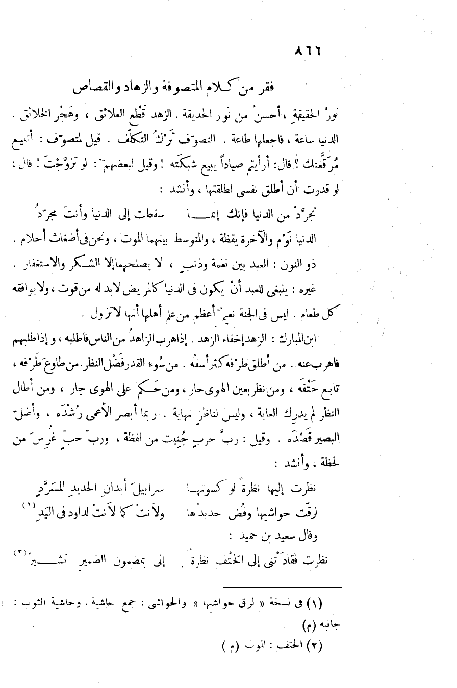 نور الحقيقة، أحسن من نور الحديقة. الزهد قطع العلائق، وهجر الخلائق.