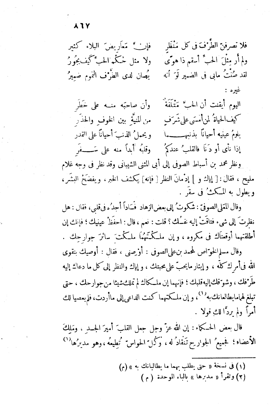 وقال مسلم الخوّاص لمحمد بن على الصوفى: أوصنى، فقال: أوصيك بتقوى الله فى أمرك كلّه، وإيثار ما يحبّ على محبتك، وإياك والنظر إلى كل ما دعاك إليه طرفك، وشوّقك إليه قلبك؛ فإنهما إن ملكاك لم تملك شيئا من جوارحك، حتى تبلغ لهما ما يطالعانك به «1» ، وإن ملكتهما كنت الداعى إلى ما أردت، فلم يعصيا لك أمرا ولم يردّا لك قولا.