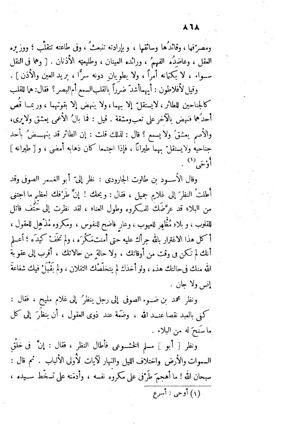 وقيل لأفلاطون: أيهما أشدّ ضررا بالقلب السمع أم البصر؟ فقال: هما للقلب كالجناحين للطائر، لا يستقلّ إلا بهما، ولا ينهض إلا بقوتهما، وربما قص أحدهما فنهض بالآخر على تعب ومشقة. قيل: فما بال الأعمى يعشق ولا يرى، والأصم يعشق ولا يسمع؟ قال: لذلك قلت: إن الطائر قد ينهض بأحد جناحيه ولا يستقلّ بهما طيرانا، فإذا اجتمعا كان ذهابه أمضى، و [طيرانه] أوحى «1» .