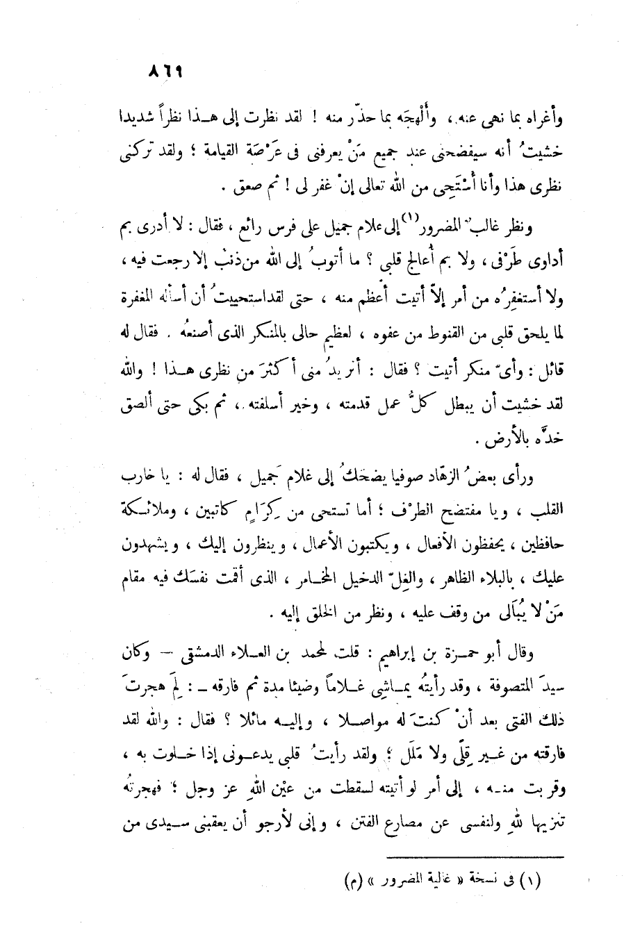 وقال أبو حمزة بن إبراهيم: قلت لمحمد بن العلاء الدمشقى- وكان سيد المتصوفة، وقد رأيته يماشى غلاما وضيئا مدة ثم فارقه-: لم هجرت ذلك الفتى بعد أن كنت له مواصلا، وإليه مائلا؟ فقال: والله لقد فارقته من غير قلى ولا ملل؛ ولقد رأيت قلبى يدعونى إذا خلوت به، وقربت منه، إلى أمر لو أتيته لسقطت من عين الله عز وجل؛ فهجرته تنزيها لله ولنفسى عن مصارع الفتن، وإنى لأرجو أن يعقبنى سيدى من