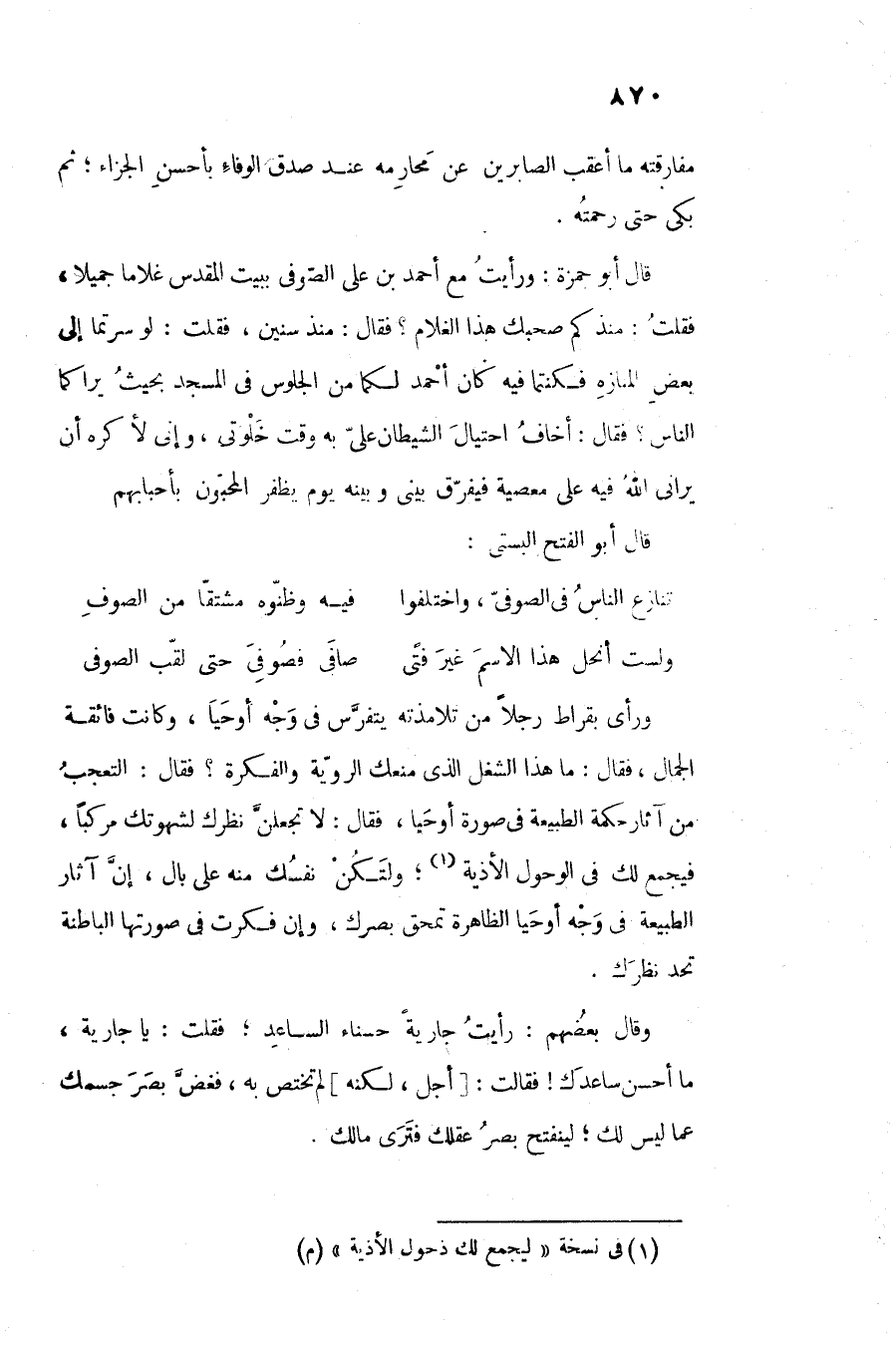 قال أبو حمزة: ورأيت مع أحمد بن على الصّوفى ببيت المقدس غلاما جميلا، فقلت: منذكم صحبك هذا الغلام؟ فقال: منذ سنين، فقلت: لو سرتما إلى بعض المنازه فكنتما فيه كان أحمد لكما من الجلوس فى المسجد بحيث يراكما الناس؟ فقال: أخاف احتيال الشيطان علىّ به وقت خلوتى، وإنى لأكره أن يرانى الله فيه على معصية فيفرّق بينى وبينه يوم يظفر المحبّون بأحبابهم قال أبو الفتح البستى: