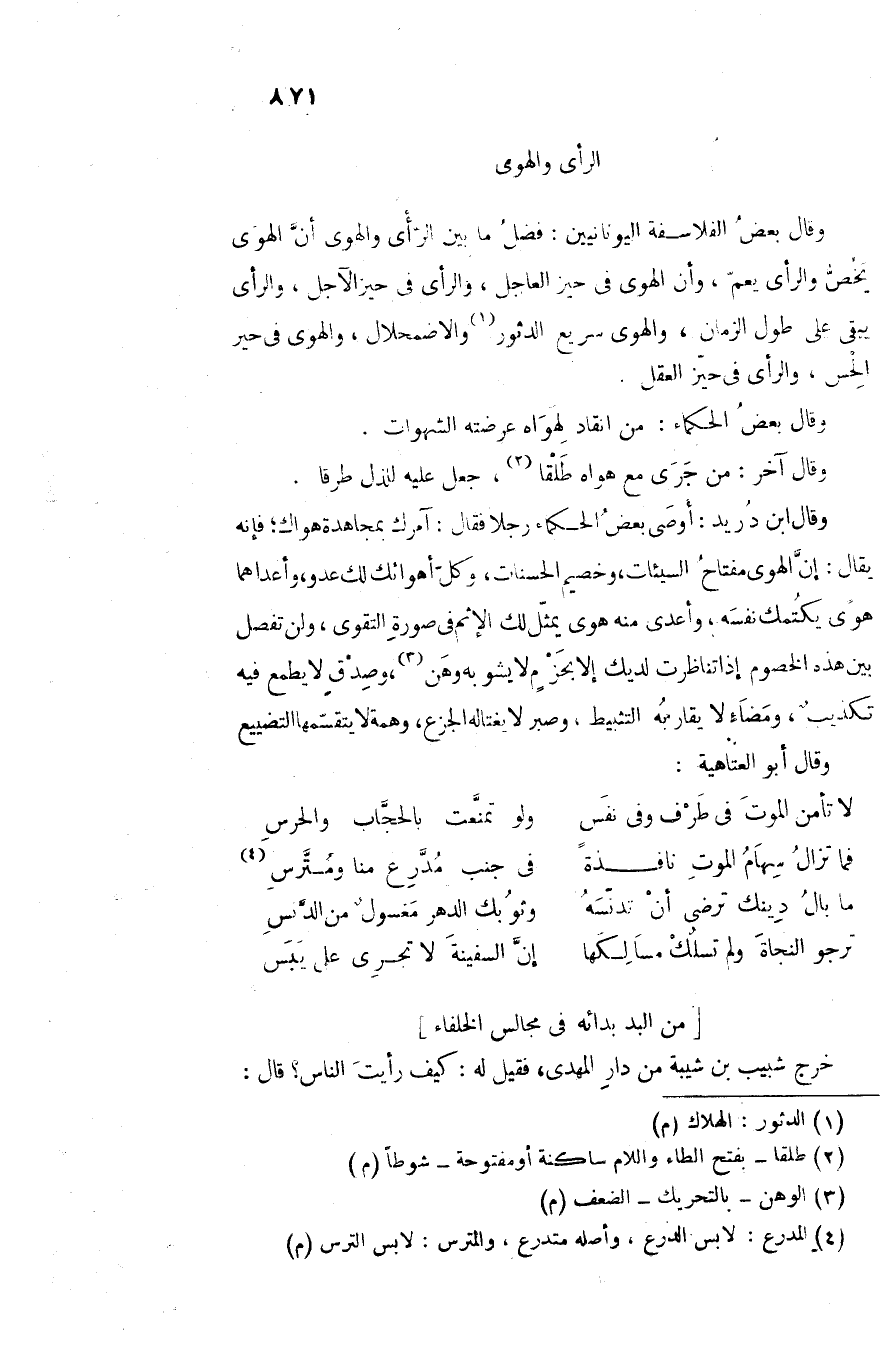 وقال ابن دريد: أوصى بعض الحكماء رجلا فقال: آمرك بمجاهدة هواك؛ فإنه يقال: إنّ الهوى مفتاح السيئات، وخصيم الحسنات، وكلّ أهوائك لك عدو، وأعداهما هوى يكتمك نفسه، وأعدى منه هوى يمثّل لك الإثم فى صورة التقوى، ولن تفصل بين هذه الخصوم إذا تناظرت لديك إلا بحزم لا يشوبه وهن «3» ، وصدق لا يطمع فيه تكذيب، ومضاء لا يقاربه التثبيط، وصبر لا يغتاله الجزع، وهمة لا يتقسّمها التضييع وقال أبو العتاهية: