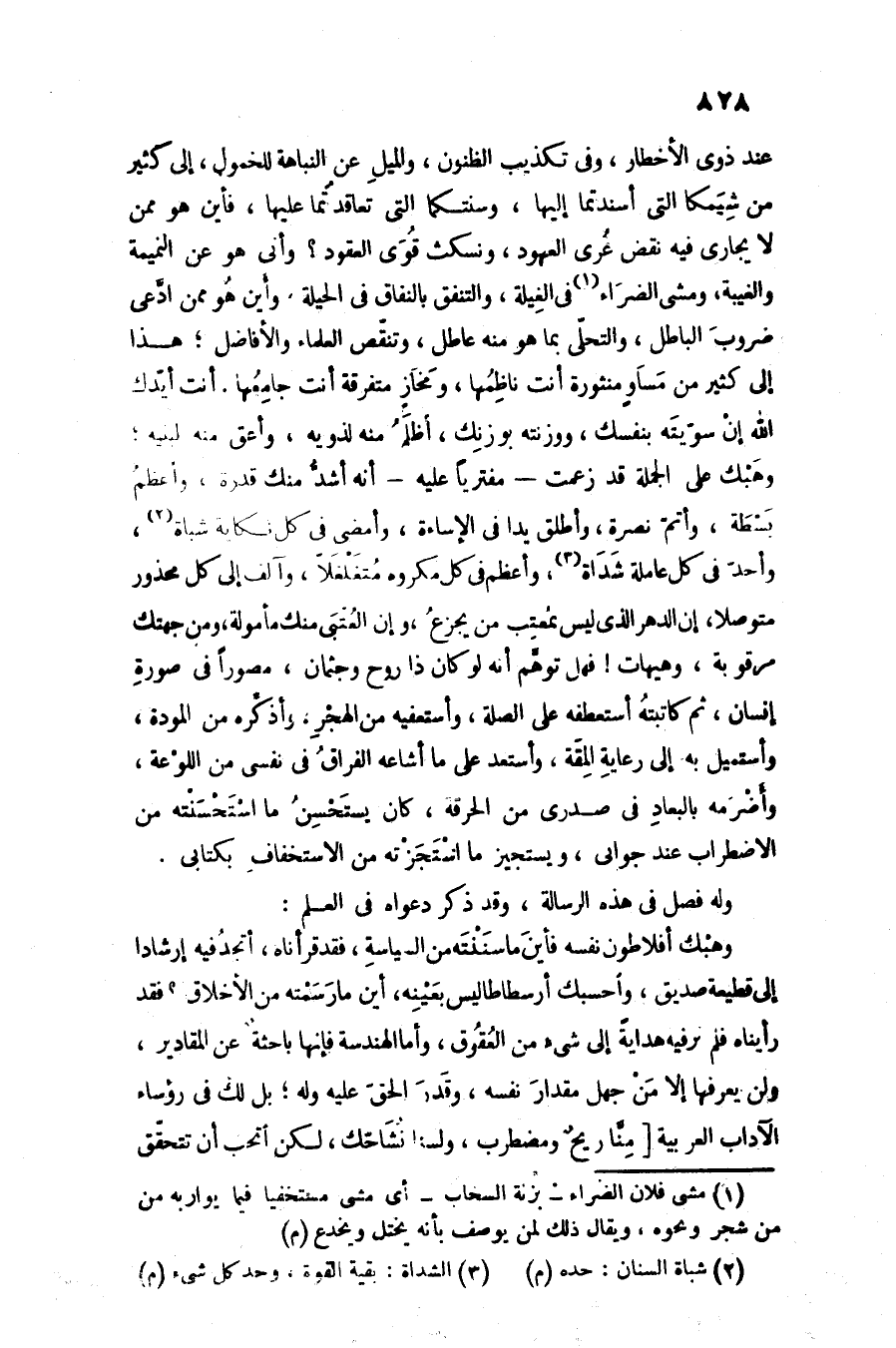 وهبك أفلاطون نفسه فأين ما سننته من السياسة، فقد قرأناه، أتجد فيه إرشادا إلى قطيعة صديق، واحسبك أرسطاطاليس بعينه، أين ما رسمته من الأخلاق؟ فقد رأيناه فلم تر فيه هداية إلى شىء من العقوق، وأما الهندسة فإنها باحثة عن المقادير، ولن يعرفها إلا من جهل مقدار نفسه، وقدر الحقّ عليه وله؛ بل لك فى رؤساء الآداب العربية [منّا ريح ومضطرب، ولسنا نشاحّك، لكن أتحب أن تتحقّق