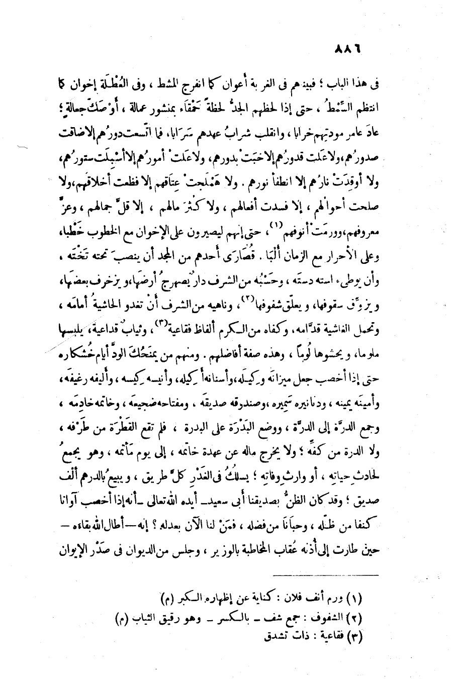 فى هذا الباب؛ فبينهم فى الغربة أعوان كما انفرج المشط، وفى العطلة إخوان كما انتظم السّمط، حتى إذا لحظهم الجدّ لحظة حمقاء بمنشور عمالة، أوصك جعالة؛ عاد عامر مودتهم خرابا، وانقلب شراب عهدهم سرابا، فما اتّسعت دورهم إلا ضاقت صدورهم، ولا علت قدورهم إلا خبت بدورهم، ولا علت أمورهم إلا أسبلت ستورهم، ولا أوقدت نارهم إلا انطفأ نورهم. ولا هملجت عتاقهم إلا فظعت أخلاقهم، ولا صلحت أحوالهم، إلا فسدت أفعالهم، ولاكثر مالهم، إلا قلّ جمالهم، وعزّ معروفهم، وورمت أنوفهم «1» ، حتى إنهم ليصيرون على الإخوان مع الخطوب خطبا، وعلى الأحرار مع الزمان ألبا. قصارى أحدهم من المجد أن ينصب تحته تخته، وأن يوطىء استه دسته، وحسبه من الشرف دار يصهرج أرضها، ويزخرف بعضها، ويزوّق سقوفها، ويعلّق شفوفها «2» ، وناهيه من الشرف أن تغدو الحاشية أمامه، وتحمل الغاشية قدّامه، وكفاه من الكرم ألفاظ فقاعية «3» ، وثياب قداعية، يلبسها ملوما، ويحشوها لوما، وهذه صفة أفاضلهم. ومنهم من يمنحك الودّ أيام خشكاره حتى إذا أخصب جعل ميزانه وكيله، وأسنانه أكيله، وأنيسه كيسه، وأليفه رغيفه، وأمينه يمينه، ودنانيره سميره، وصندوقه صديقه، ومفتاحه ضجيعه، وخاتمه خادمه، وجمع الدرّة إلى الدرّة، ووضع البدرة على البدرة، فلم تقع القطرة من طرفه، ولا الدرة من كفّه؛ ولا يخرج ماله عن عهدة خاتمه، إلى يوم مأتمه، وهو يجمع لحادث حياته، أو وارث وفاته؛ يسلك فى الغدر كلّ طريق، ويبيع بالدرهم ألف صديق؛ وقد كان الظنّ بصديقنا أبى سعيد- أيده الله تعالى- أنه إذا أخصب آوانا كنفا من ظلّه، وحبانا من فضله، فمن لنا الآن بعدله؟ إنه- أطال الله بقاءه- حين طارت إلى أذنه عقاب المخاطبة بالوزير، وجلس من الديوان فى صدر الإيوان
