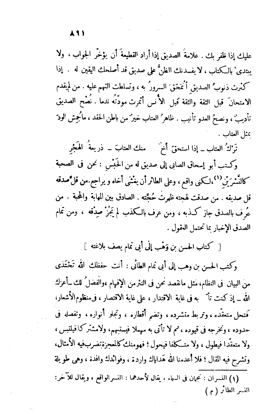 وكتب الحسن بن وهب إلى أبى تمام الطائى: أنت حفظك الله تحتذى من البيان فى النظام، مثل ما نقصد نحن فى النثر من الإفهام، والفضل لك- أعزك الله- إذ كنت تأتى به فى غاية الاقتدار، على غاية الاقتصار، فى منظوم الأشعار، فتحل متعقّده، وتربط متشرده، وتضم أقطاره، وتجلو أنواره، وتفصله فى حدوده، وتخرجه فى قيوده، ثم لا تأتى به مهملا فيستبهم، ولا مشتركا فيلتبس، ولا متعقّدا فيطول، ولا متكلفا فيحول؛ فهو منك كالمعجزة تضرب فيه الأمثال، وتشرح فيه المقال؛ فلا أعدمنا الله هداياك واردة، وفوائدك وافدة، وهى طويلة