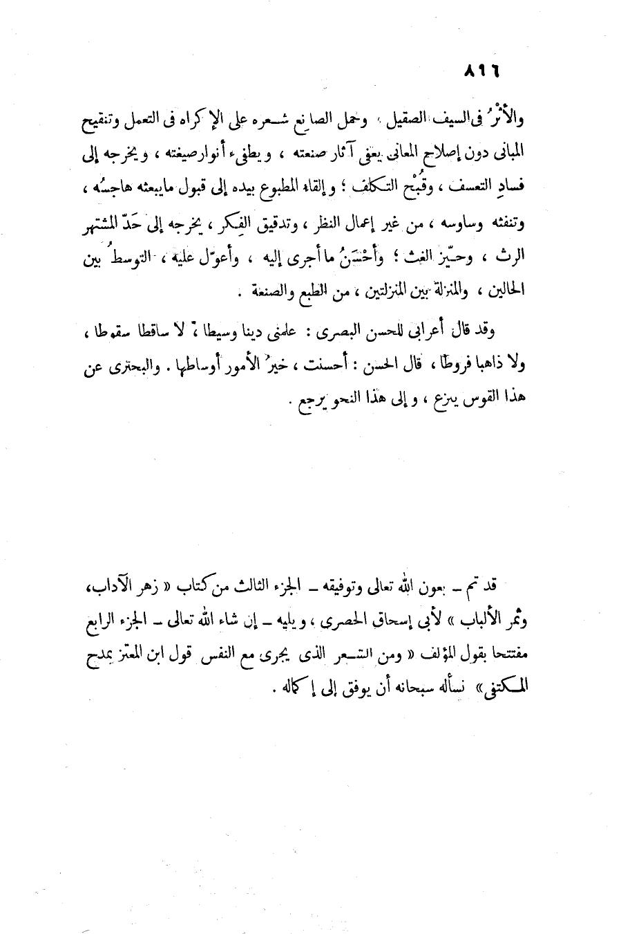 قد تم- بعون الله تعالى وتوفيقه- الجزء الثالث من كتاب «زهر الآداب، وثمر الألباب» لأبى إسحاق الحصرى، ويليه- إن شاء الله تعالى- الجزء الرابع مفتتحا بقول المؤلف «ومن الشعر الذى يجرى مع النفس قول ابن المعتز بمدح المكتفى» نسأله سبحانه أن يوفق إلى إكماله.