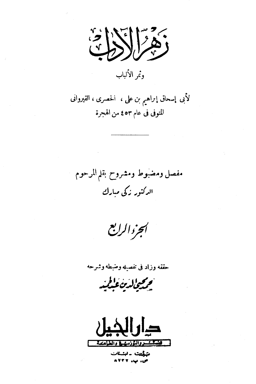 زهر الأداب وثمر الألباب لأبى إسحاق إبراهيم بن على، الحصرى، القيروانى المتوفى فى عام 453 من الهجرة مفصل ومضبوط ومشروح بقلم المرحوم الدكتور زكى مبارك الجزء الرابع حققه وزاد فى تفضيله وضبطه وشرحه صمد محيى الدين عبد الحميد وابرار الجيل بيروت