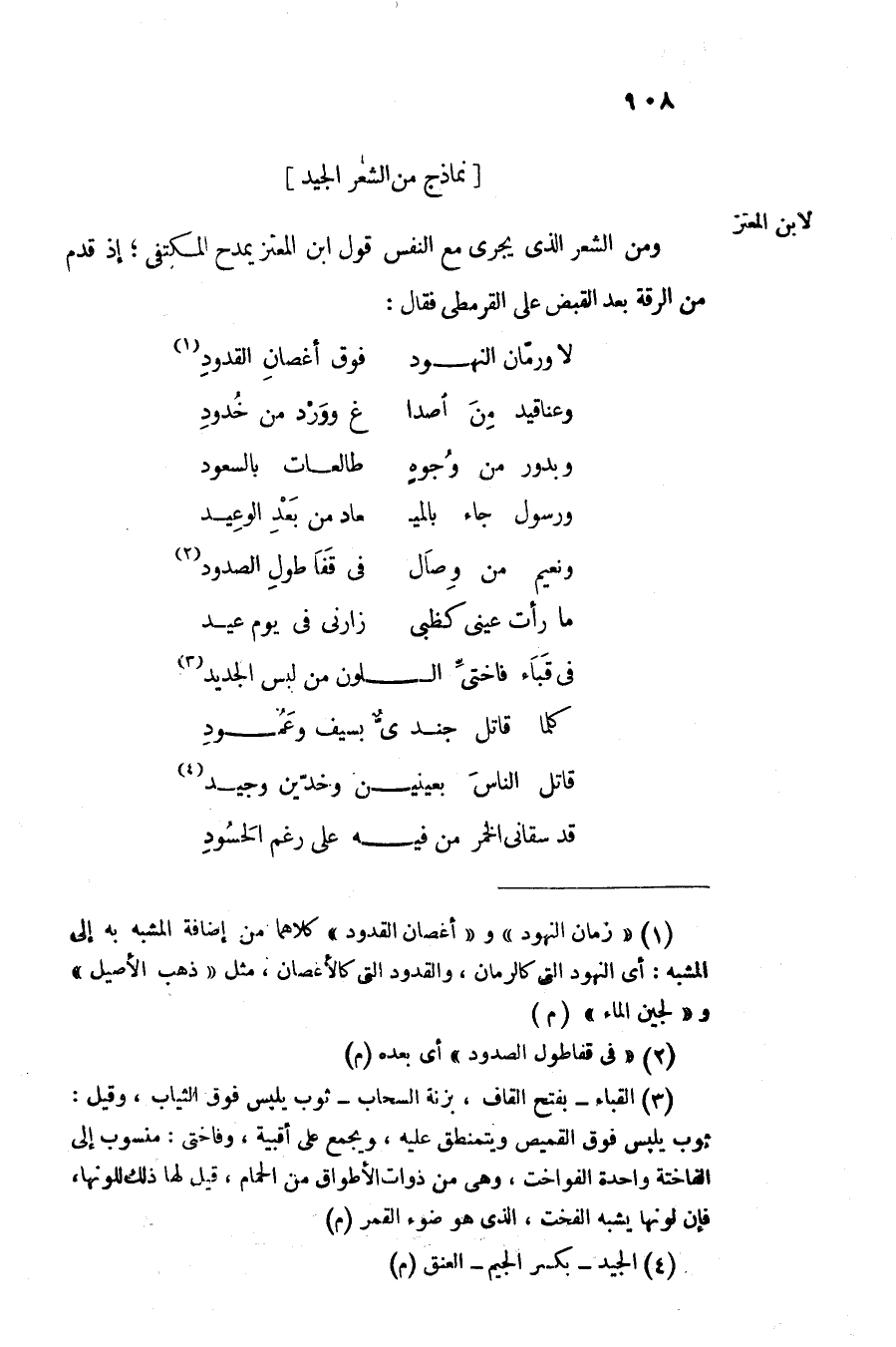 ومن الشعر الذى يجرى مع النفس قول ابن المعتز يمدح المكتفى؛ إذ قدم من الرقة بعد القبض على القرمطى فقال: