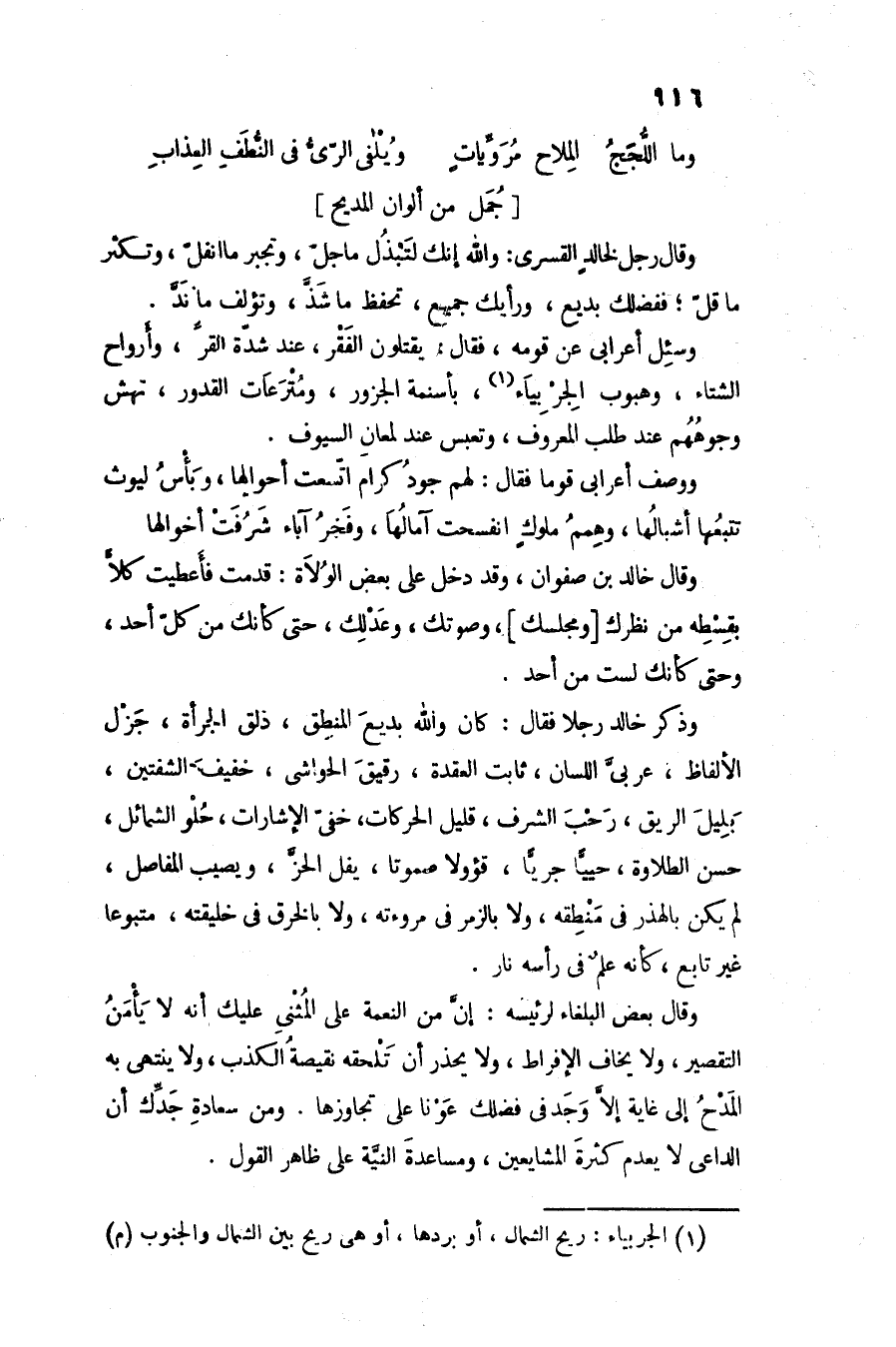 وذكر خالد رجلا فقال: كان والله بديع المنطق، ذلق الجرأة، جزل الألفاظ، عربىّ اللسان، ثابت العقدة، رقيق الحواشى، خفيف الشفتين، بليل الريق، رحب الشرف، قليل الحركات، خفىّ الإشارات، حلو الشمائل، حسن الطلاوة، حييّا جريّا، قؤولا صموتا، يفل الحزّ، ويصيب المفاصل، لم يكن بالهذر فى منطقه، ولا بالزمر فى مروءته، ولا بالخرق فى خليقته، متبوعا غير تابع، كأنه علم فى رأسه نار.