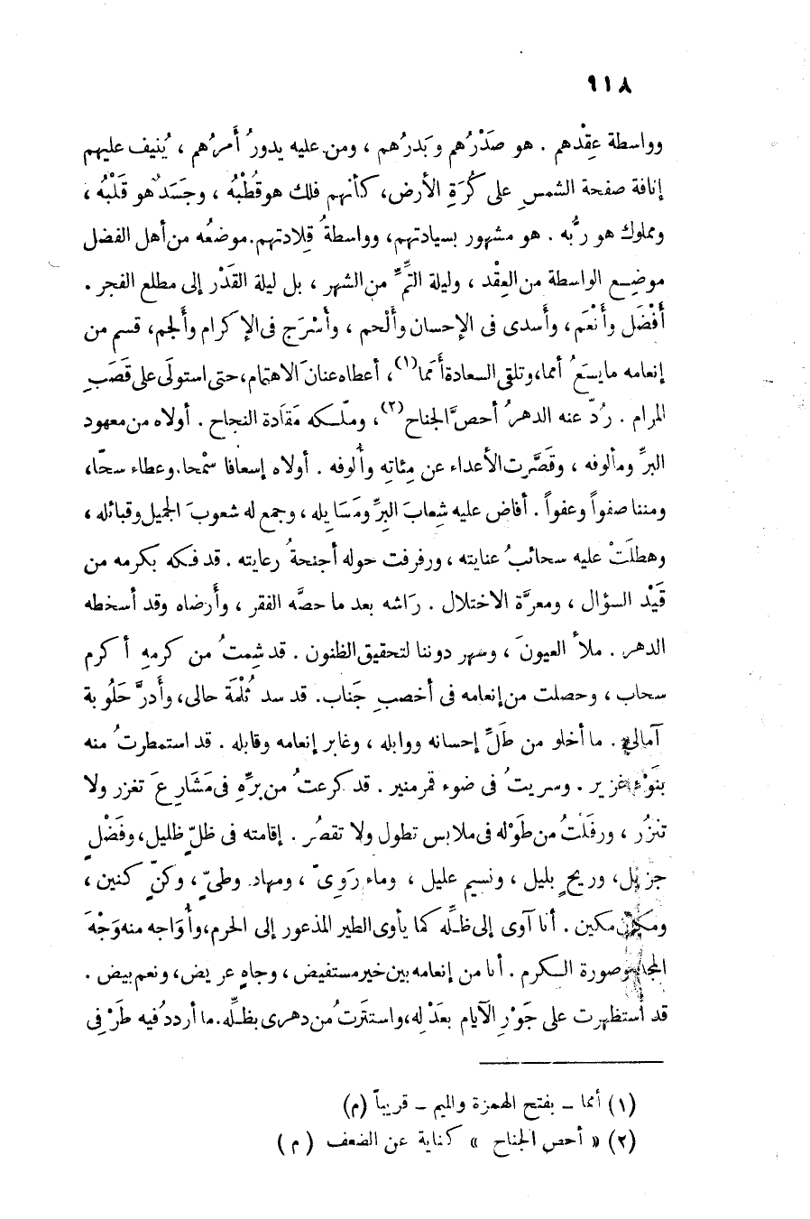 أفضل وأنعم، وأسدى فى الإحسان وألحم، وأسرج فى الإكرام وألجم، قسم من إنعامه ما يسع أمما، وتلقى السعادة أمما «1» ، أعطاه عنان الاهتمام، حتى استولى على قصب المرام. ردّ عنه الدهر أحصّ الجناح «2» ، وملّكه مقادة النجاح. أولاه من معهود البرّ ومألوفه، وقصّرت الأعداء عن مئاته وألوفه. أولاه إسعافا سمحا وعطاء سحّا، ومننا صفوا وعفوا. أفاض عليه شعاب البرّ ومسايله، وجمع له شعوب الجميل وقبائله، وهطلت عليه سحائب عنايته، ورفرفت حوله أجنحة رعايته. قد فكه بكرمه من قيد السؤال، ومعرّة الاختلال. راشه بعد ما حصّه الفقر، وأرضاه وقد أسخطه الدهر. ملأ العيون، وسهر دوننا لتحقيق الظنون. قد شمت من كرمه أكرم سحاب، وحصلت من إنعامه فى أخصب جناب. قد سد ثلمة حالى، وأدرّ حلوبة آمالى. ما أخلو من طلّ إحسانه ووابله، وغابر إنعامه وقابله. قد استمطرت منه بنوء غزير. وسريت فى ضوء قمر منير. قد كرعت من برّه فى مشارع تغزر ولا تنزر، ورفلت من طوله فى ملابس تطول ولا تقصر. إقامته فى ظلّ ظليل، وفضل جزيل، وريح بليل، ونسيم عليل، وماء روىّ، ومهاد وطىّ، وكنّ كنين، ومكان مكين. أنا آوى إلى ظلّه كما يأوى الطير المذعور إلى الحرم، وأواجه منه وجه المجد وصورة الكرم. أنا من إنعامه بين خير مستفيض، وجاه عريض، ونعم بيض.