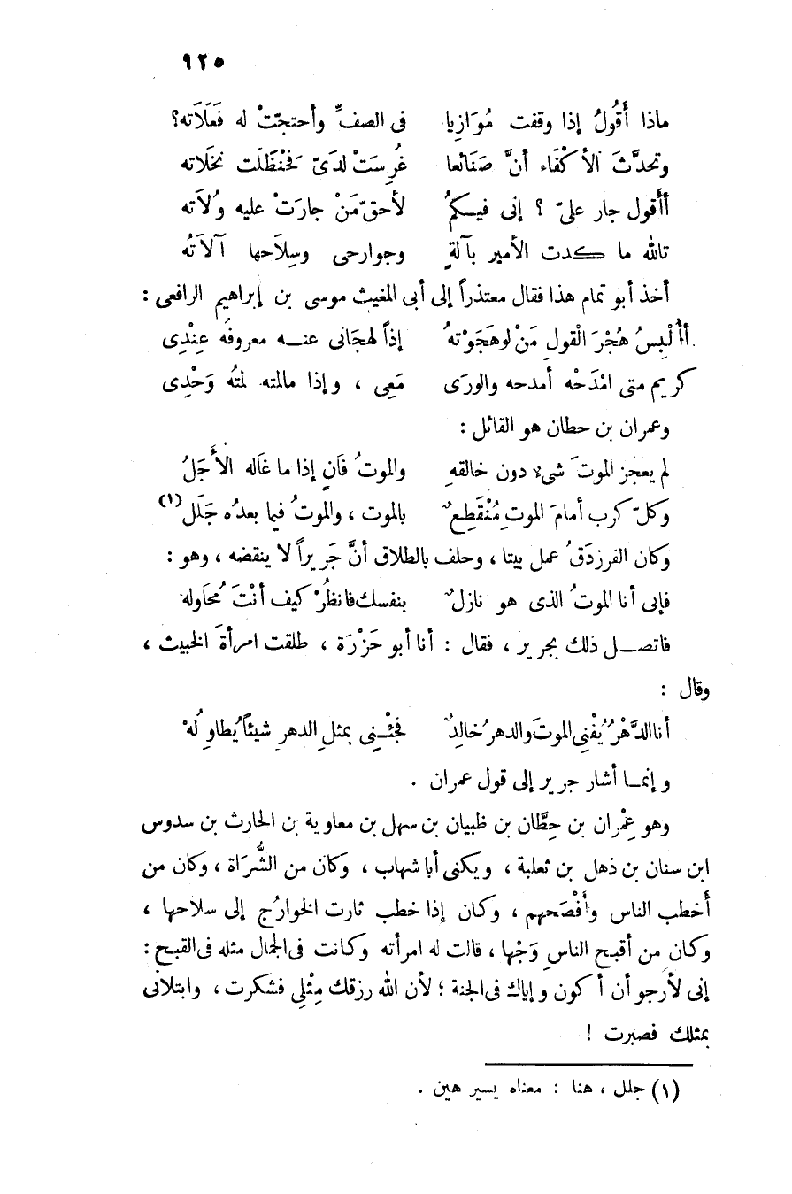 وهو عمران بن حطّان بن ظبيان بن سهل بن معاوية بن الحارث بن سدوس ابن سنان بن ذهل بن ثعلبة، ويكنى أبا شهاب، وكان من الشّراة، وكان من أخطب الناس وأفصحهم، وكان إذا خطب ثارت الخوارج إلى سلاحها، وكان من أقبح الناس وجها، قالت له امرأته وكانت فى الجمال مثله فى القبح: