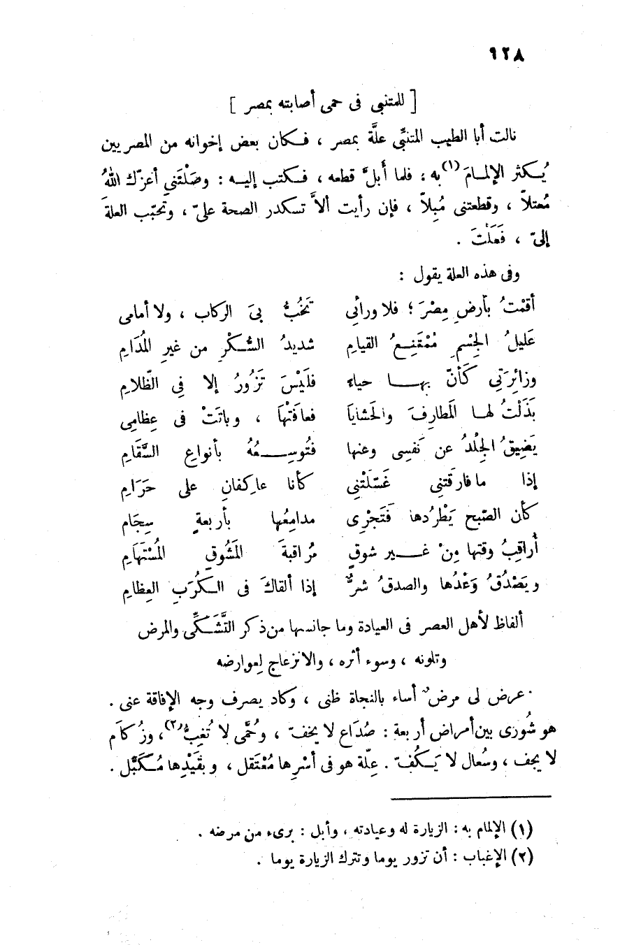 نالت أبا الطيب المتنبّى علّة بمصر، فكان بعض إخوانه من المصريين يكثر الإلمام «1» به: فلما أبلّ قطعه، فكتب إليه: وصلتنى أعزّك الله معتلا، وقطعتنى مبلّا، فإن رأيت ألّا تسكدر الصحة علىّ، وتحبّب العلة إلىّ، فعلت.