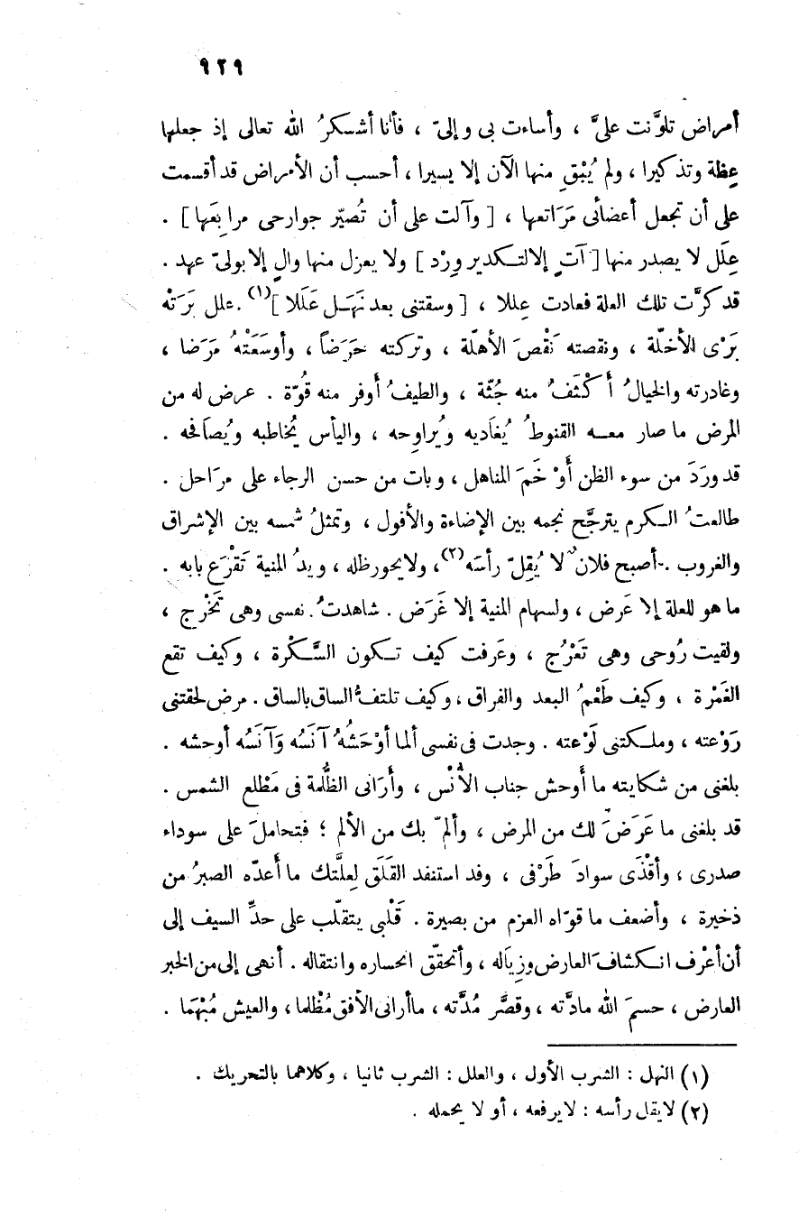 أمراض تلوّنت علىّ، وأساءت بى وإلىّ، فأنا أشكر الله تعالى إذ جعلها عظة وتذكيرا، ولم يبق منها الآن إلا يسيرا، أحسب أن الأمراض قد أقسمت على أن تجعل أعضائى مراتعها، [وآلت على أن تصيّر جوارحى مرابعها] .