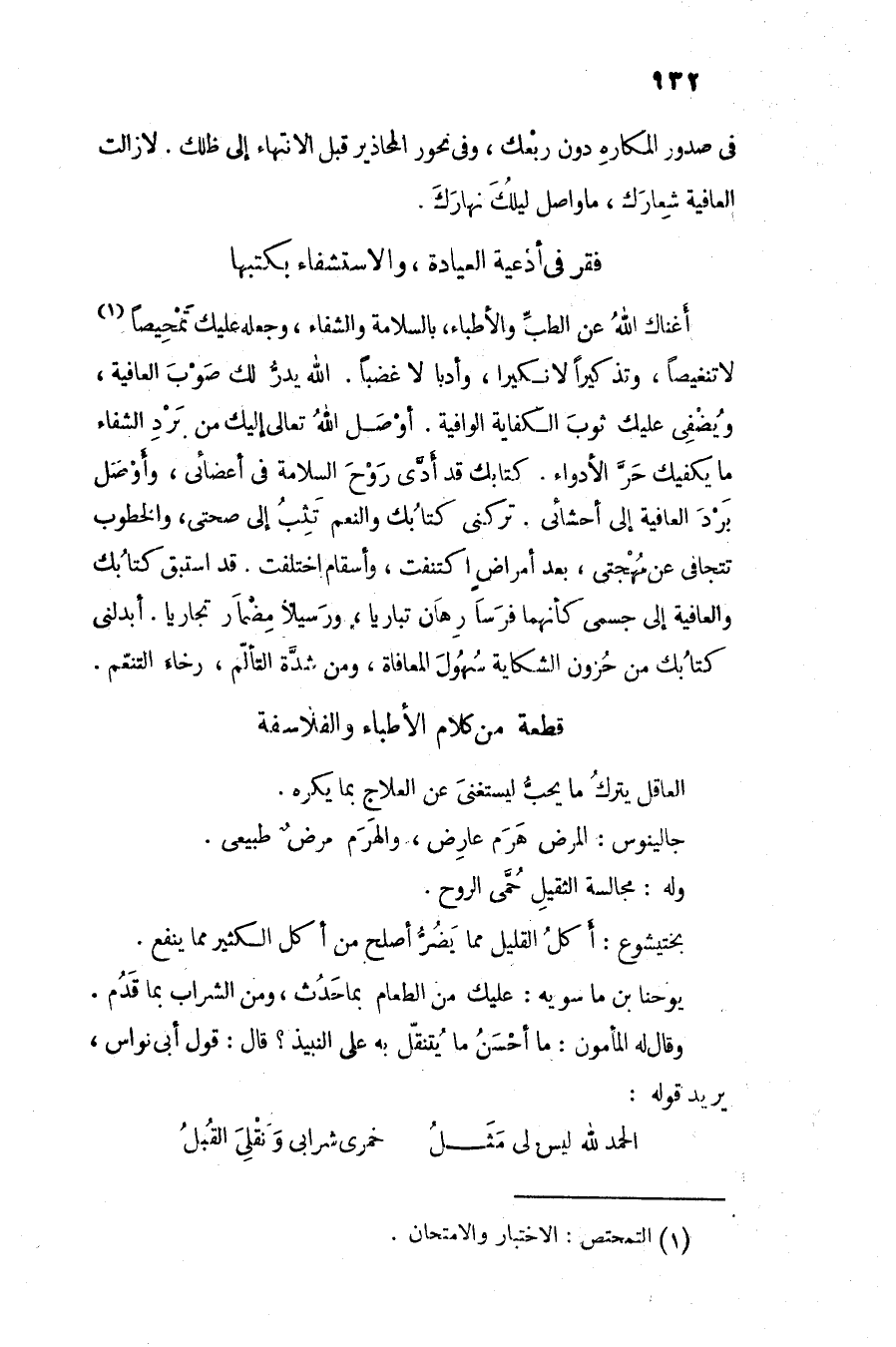 أغناك الله عن الطبّ والأطباء، بالسلامة والشفاء، وجعله عليك تمحيصا «1» لا تنغيصا، وتذكيرا لا نكيرا، وأدبا لا غضبا. الله يدرّ لك صوب العافية، ويضفى عليك ثوب الكفاية الوافية. أوصل الله تعالى إليك من برد الشفاء ما يكفيك حرّ الأدواء. كتابك قد أدّى روح السلامة فى أعضائى، وأوصل برد العافية إلى أحشائى. تركنى كتابك والنعم تثب إلى صحتى، والخطوب تتجافى عن مهجتى، بعد أمراض اكتنفت، وأسقام اختلفت. قد استبق كتابك والعافية إلى جسمى كأنهما فرسا رهان تباريا، ورسيلا مضمار تجاريا. أبدلنى كتابك من حزون الشكاية سهول المعافاة، ومن شدّة التألّم، رخاء التنعّم.