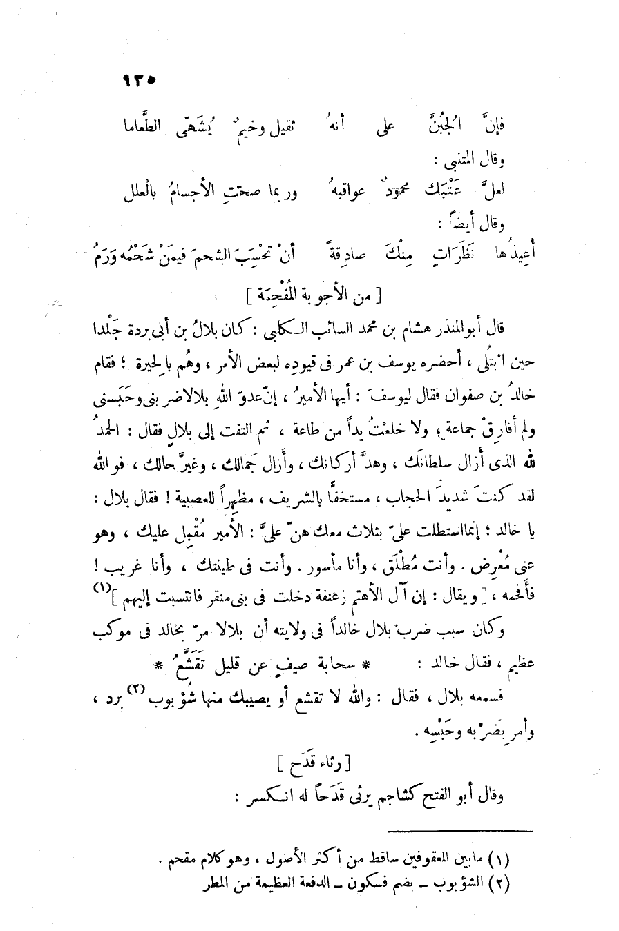 يا خالد؛ إنما استطلت علىّ بثلاث معك هنّ علىّ: الأمير مقبل عليك، وهو عنى معرض. وأنت مطلق، وأنا مأسور. وأنت فى طينتك، وأنا غريب! فأفحمه، [ويقال: إن آل الأهتم زعنفة دخلت فى بنى منقر فانتسبت إليهم] «1» وكان سبب ضرب بلال خالدا فى ولايته أن بلالا مرّ بخالد فى موكب عظيم، فقال خالد: