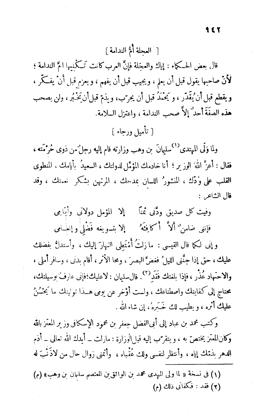 ولما ولّى المهتدى «1» سليمان بن وهب وزارته قام إليه رجل من ذوى حرمته، فقال: أعزّ الله الوزير؛ أنا خادمك المؤمّل لدولتك، السعيد بأيامك، المنطوى القلب على ودّك، المنشور اللسان بمدحك، المرتهن بشكر نعمتك، وقد قال الشاعر: