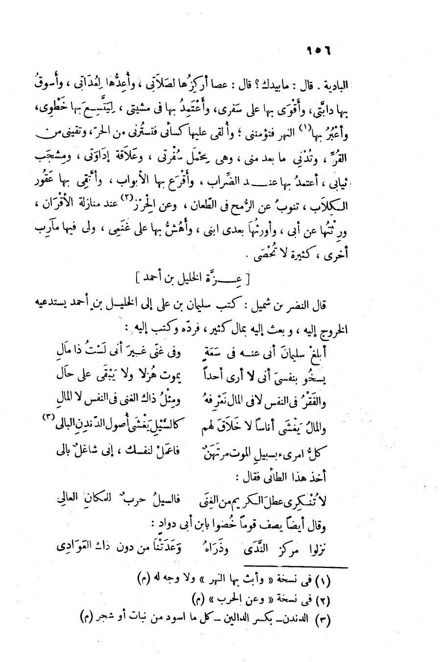 قال النضر بن شميل: كتب سليمان بن على إلى الخليل بن أحمد يستدعيه الخروج إليه، وبعث إليه بمال كثير، فردّه وكتب إليه: